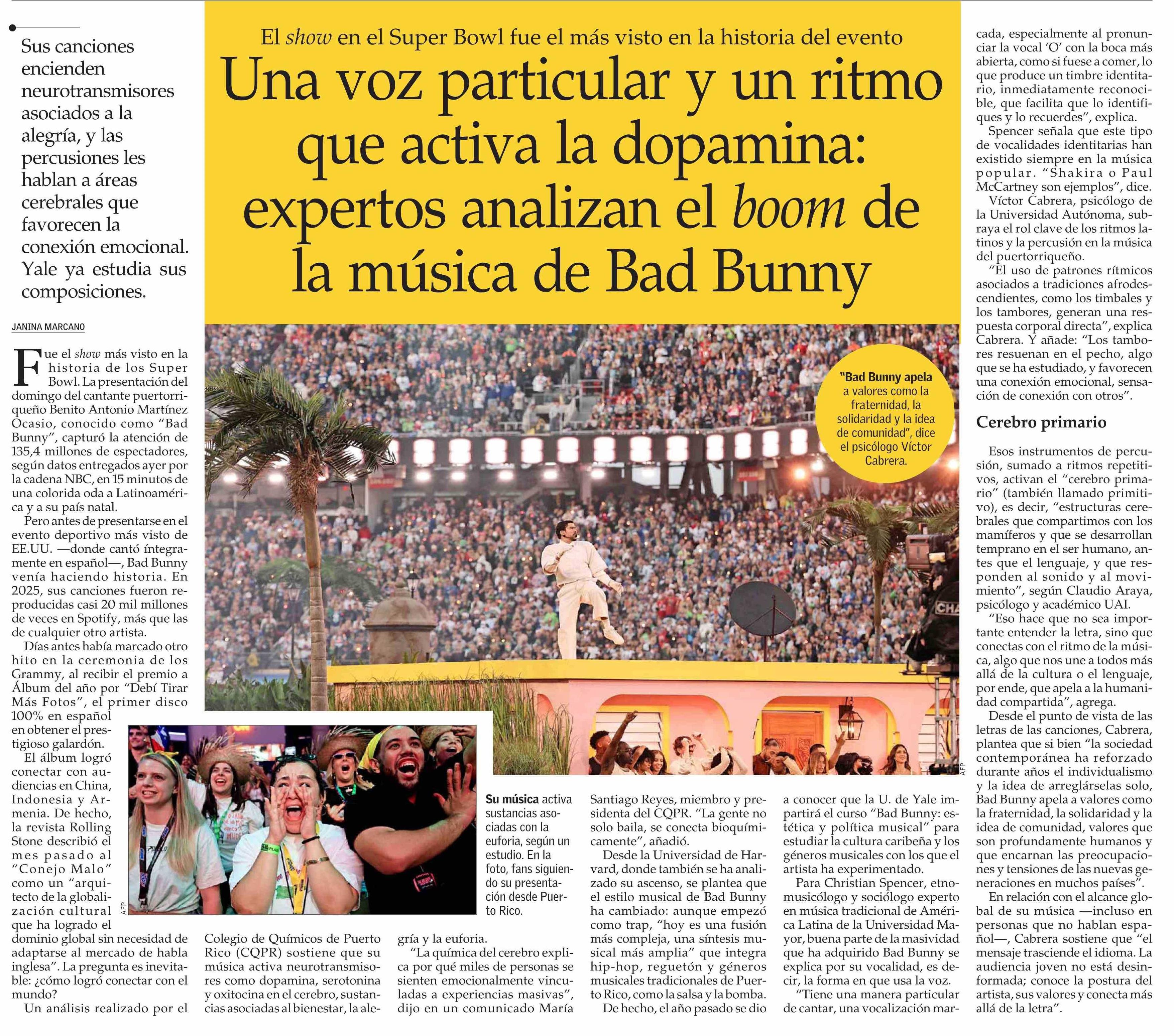 Una voz particular y un ritmo que activa la dopamina: expertos analizan el boom de la música de Bad Bunny 10-02-2026 El Mercurio |