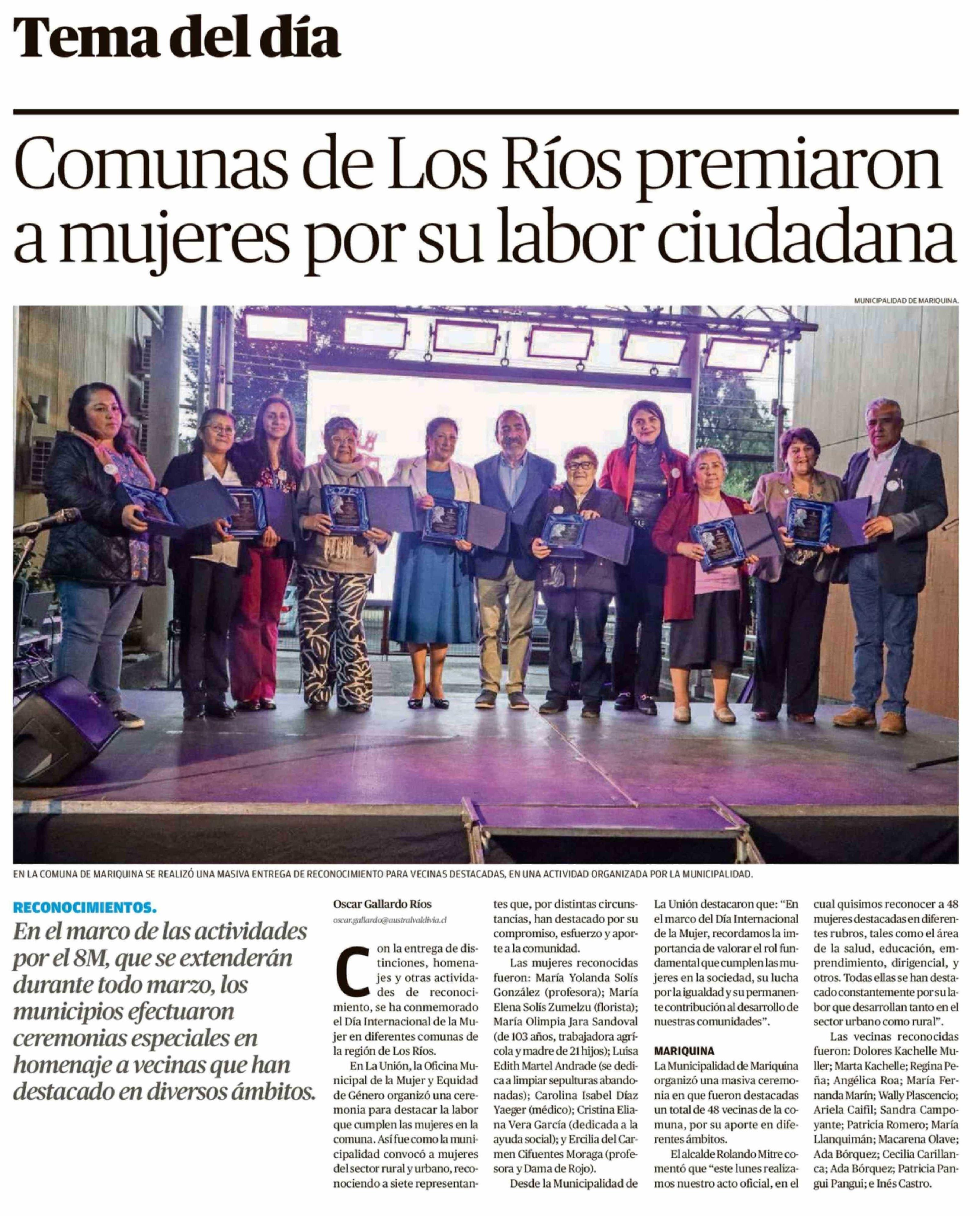 Comunas de Los Ríos premiaron a mujeres por su labor ciudadana 11-03-2026 Diario Austral Región de Los Ríos |
