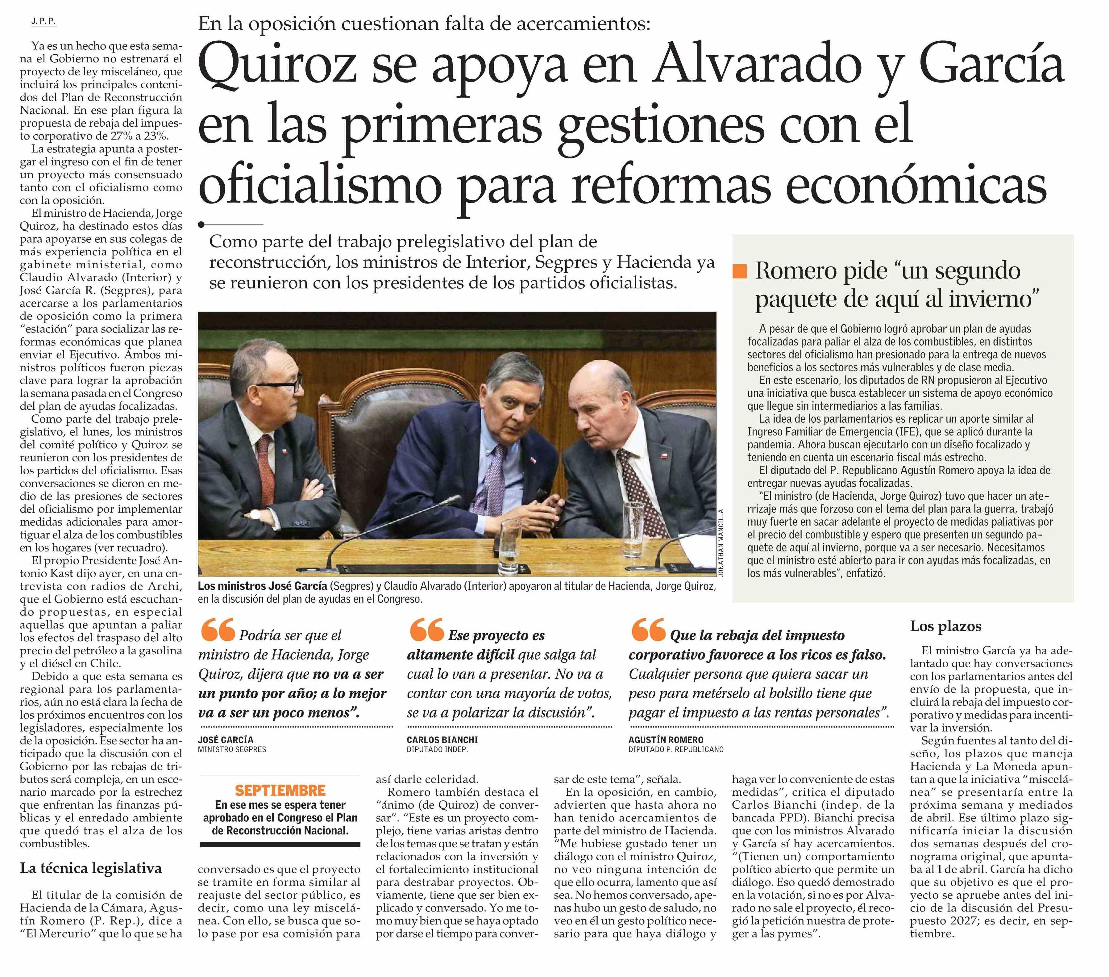 Título: Quiroz se apoya en Alvarado y García en las primeras gestiones con el oficialismo para reformas económicas