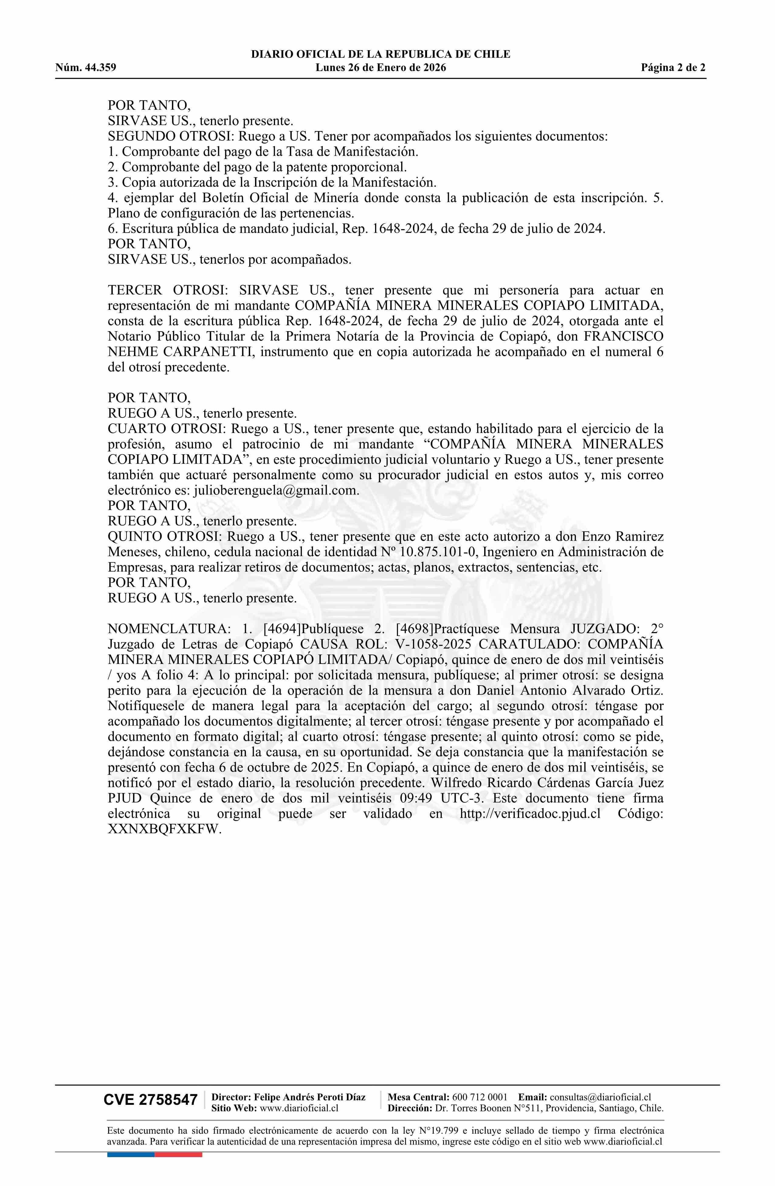 26-01-2026 DIARIO OFICIAL CHILE - BOLETÍN OFICIAL DE MINERÍA