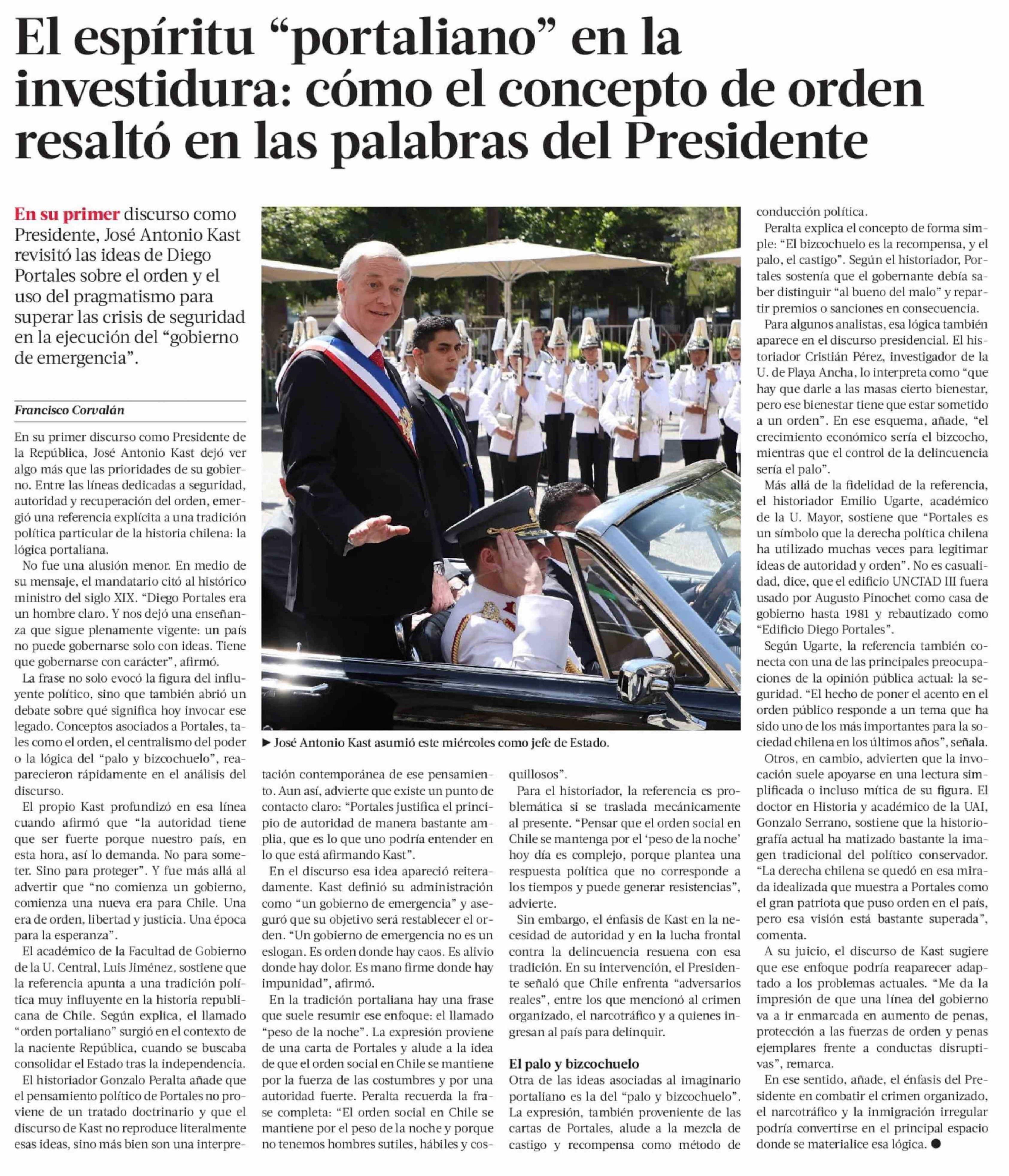 El espíritu "portaliano" en la investidura: cómo el concepto de orden resaltó en las palabras del Presidente 13-03-2026 La Tercera |