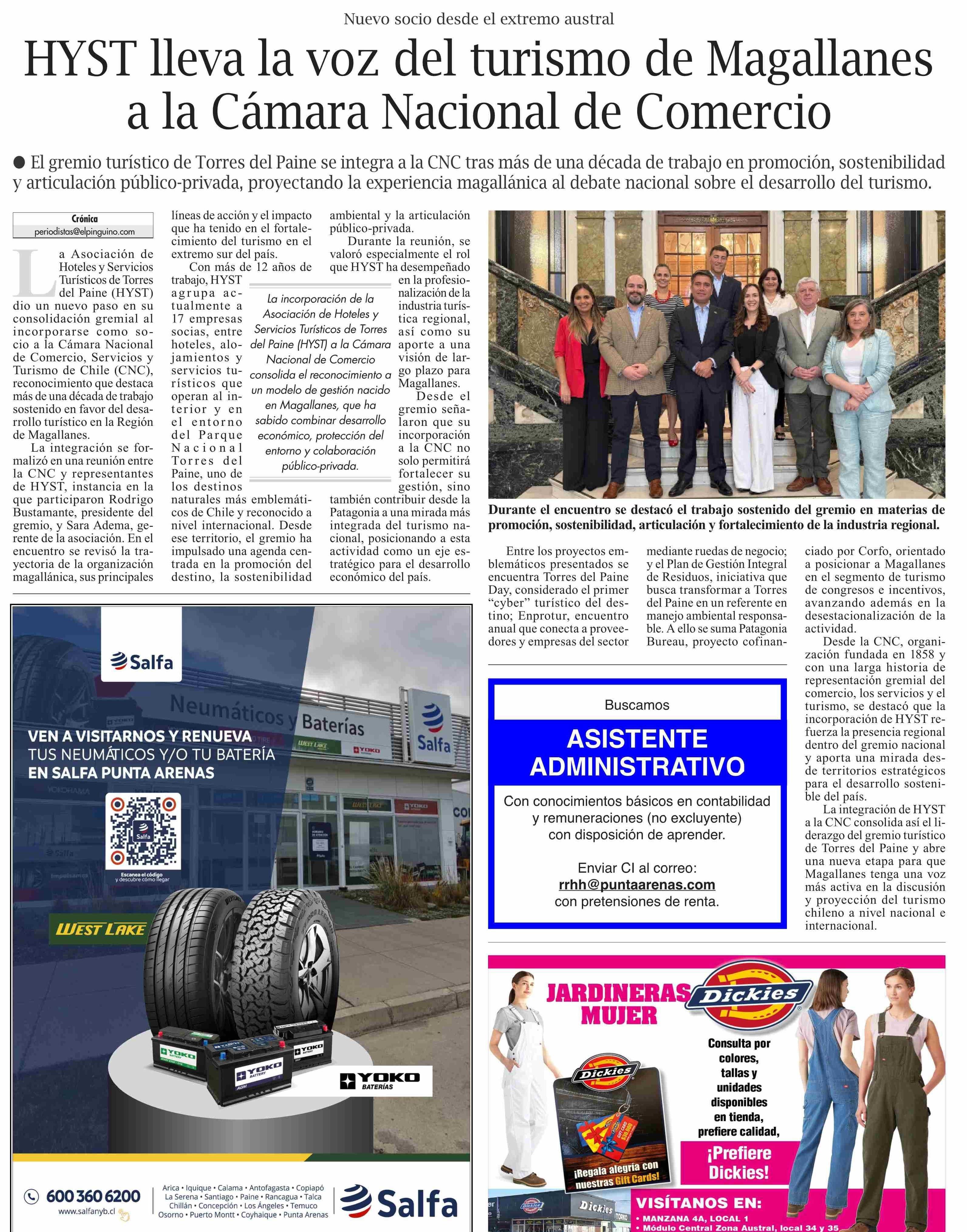 HYST lleva la voz del turismo de Magallanes a la Cámara Nacional de Comercio 12-01-2026 El Pingüino |