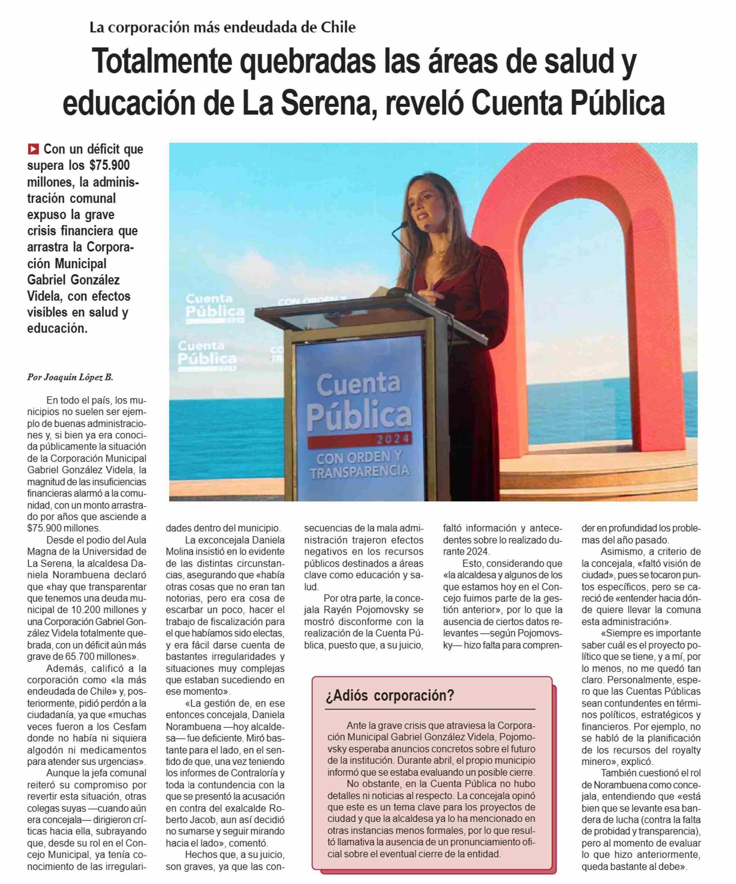Totalmente quebradas las áreas de salud y educación de La Serena, reveló Cuenta Pública 02-05-2025 Diario la Región |