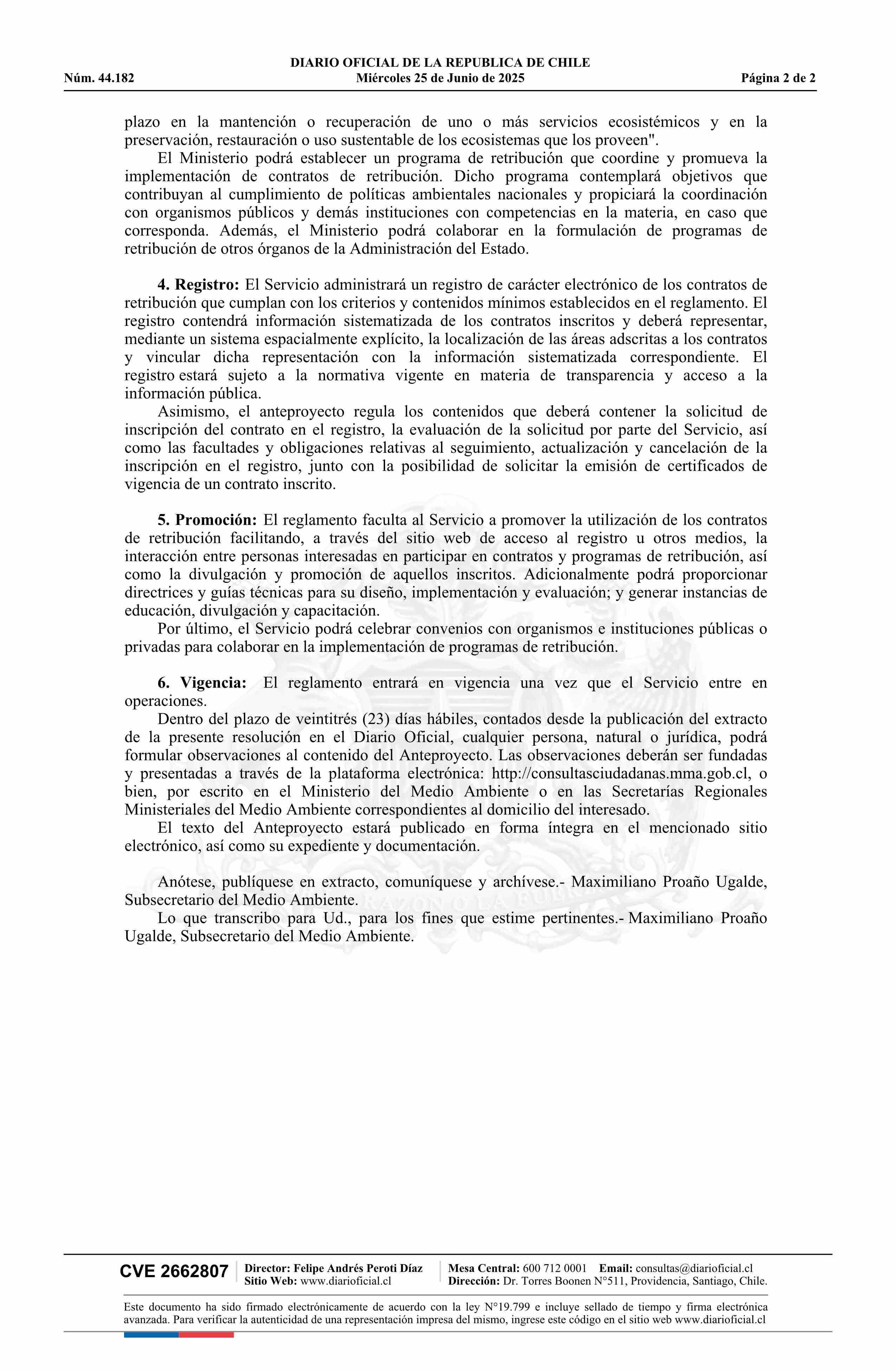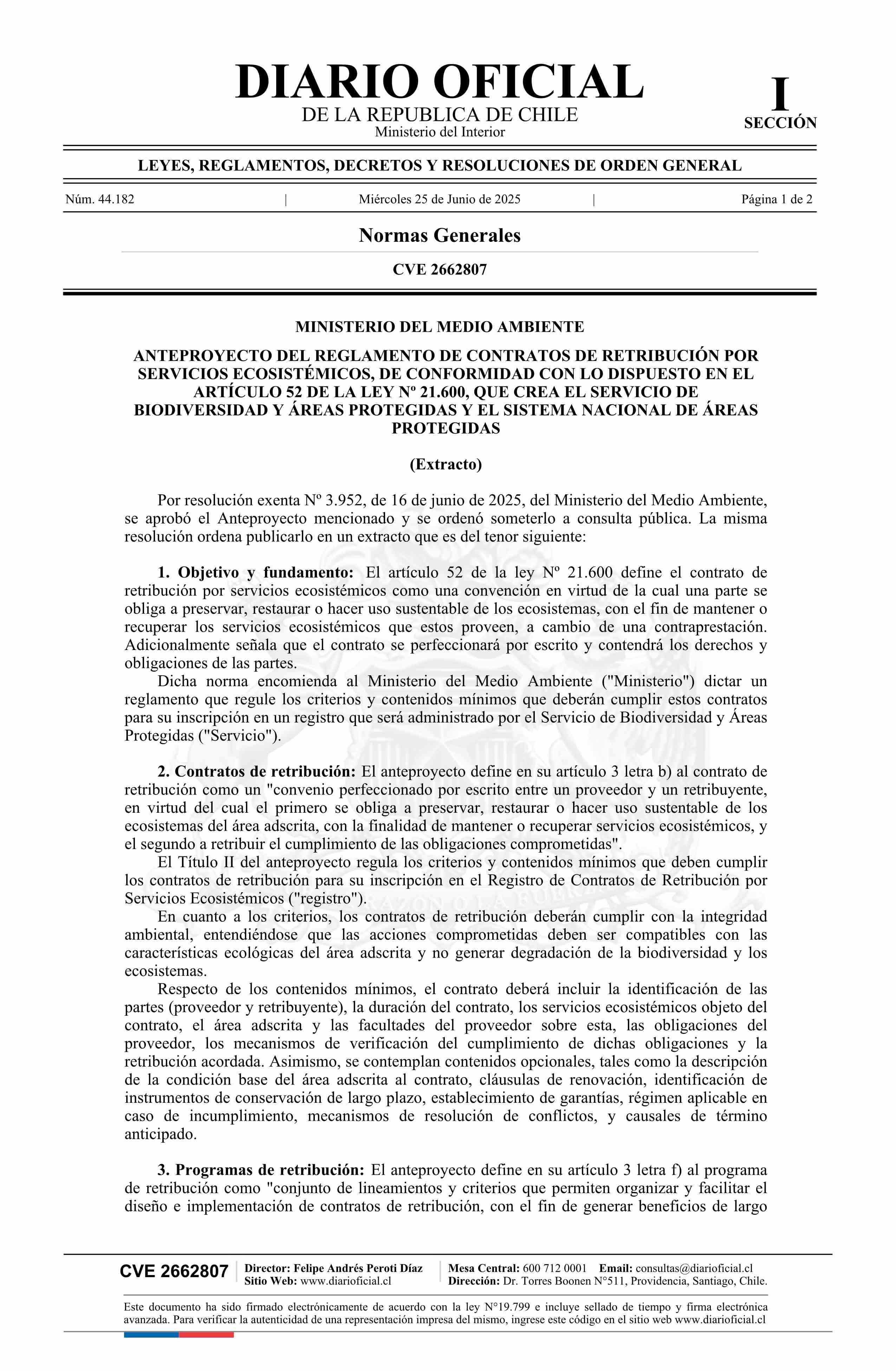 | Título: | Extracto de resolución exenta número 3.952, de 2025.- Aprueba Anteproyecto del Reglamento de Contratos de Retribución por Servicios Ecosistémicos, de conformidad con lo dispuesto en el artículo 52 de la ley Nº 21.600, que crea el Servicio de Biodiversidad y Áreas Protegidas y el Sistema Nacional de |