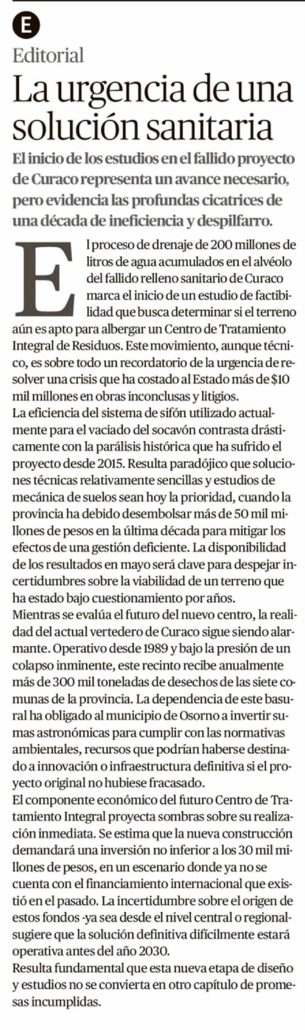 Editorial: La urgencia de una solución sanitaria 03-04-2026 El Austral de Osorno |