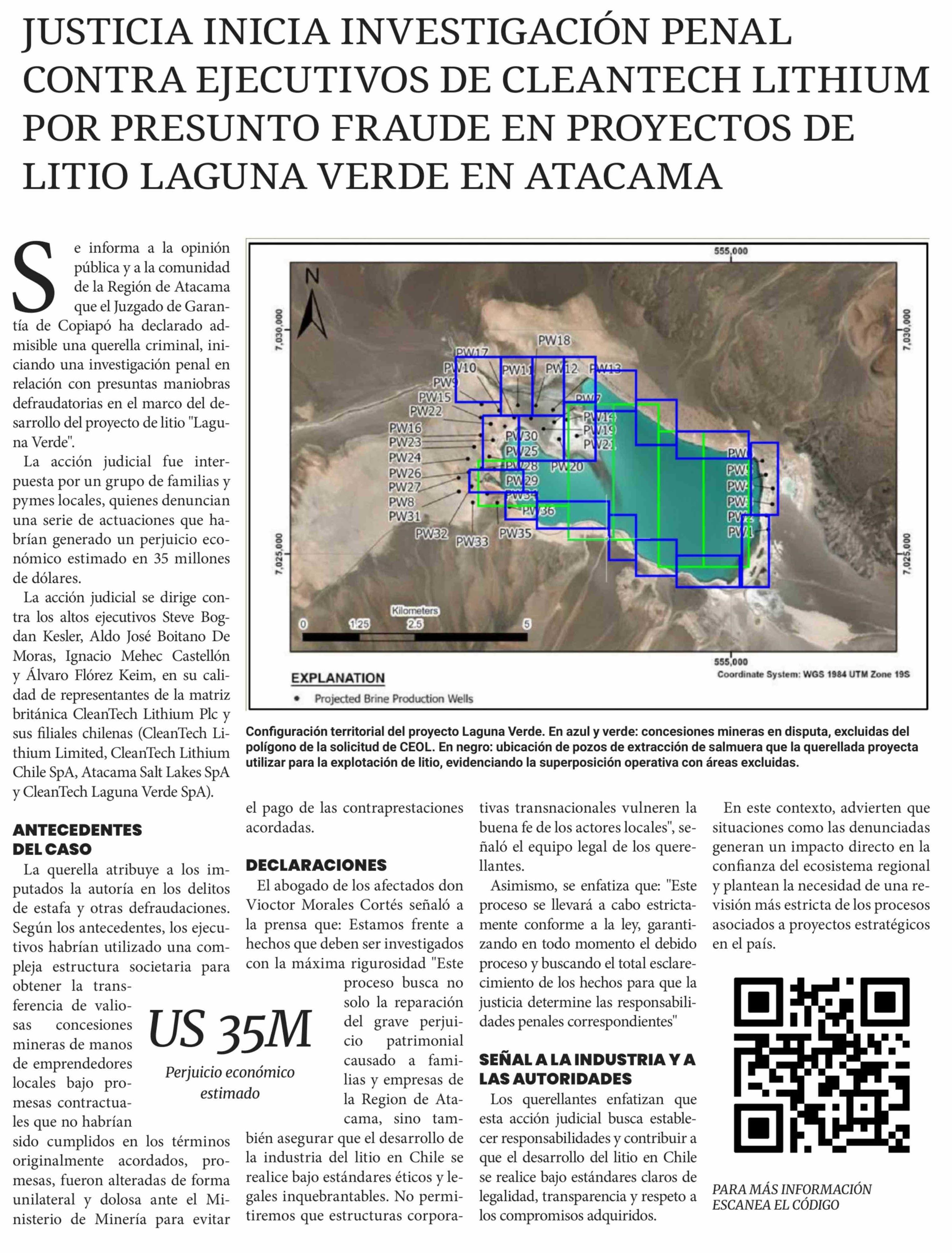 JUSTICIA INICIA INVESTIGACIÓN PENAL CONTRA EJECUTIVOS DE CLEANTECH LITHIUM POR PRESUNTO FRAUDE EN PROYECTOS DE LITIO LAGUNA VERDE EN ATACAMA 15-04-2026 Diario Chañarcillo |