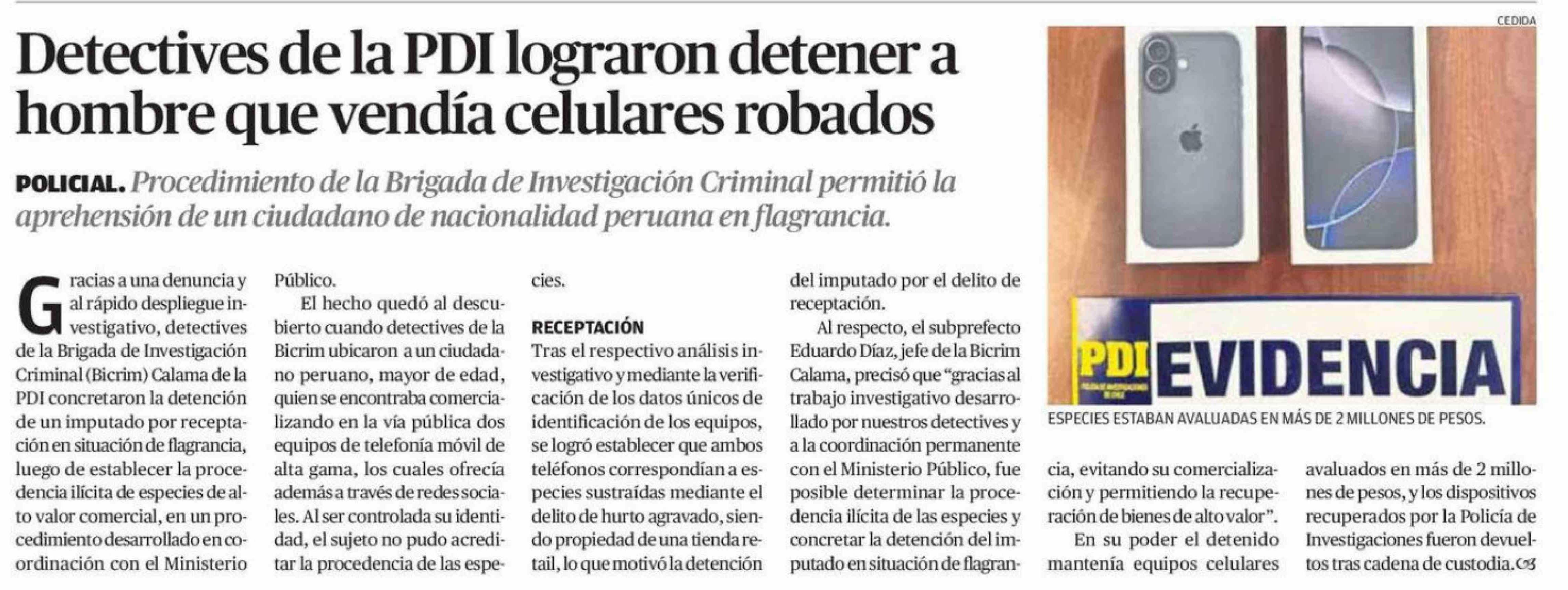 Detectives de la PDI lograron detener a hombre que vendía celulares robados 03-02-2026 El Mercurio de Calama |