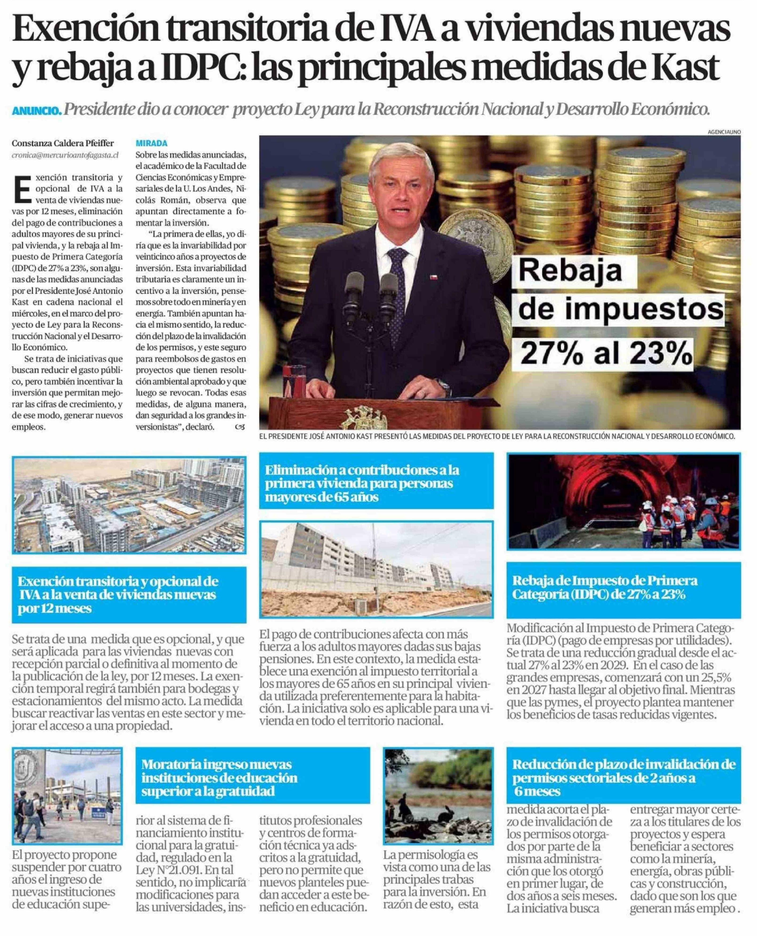 Exención transitoria de IVA a viviendas nuevas y rebaja a IDPC: las principales medidas de Kast 18-04-2026 El Mercurio de Calama |