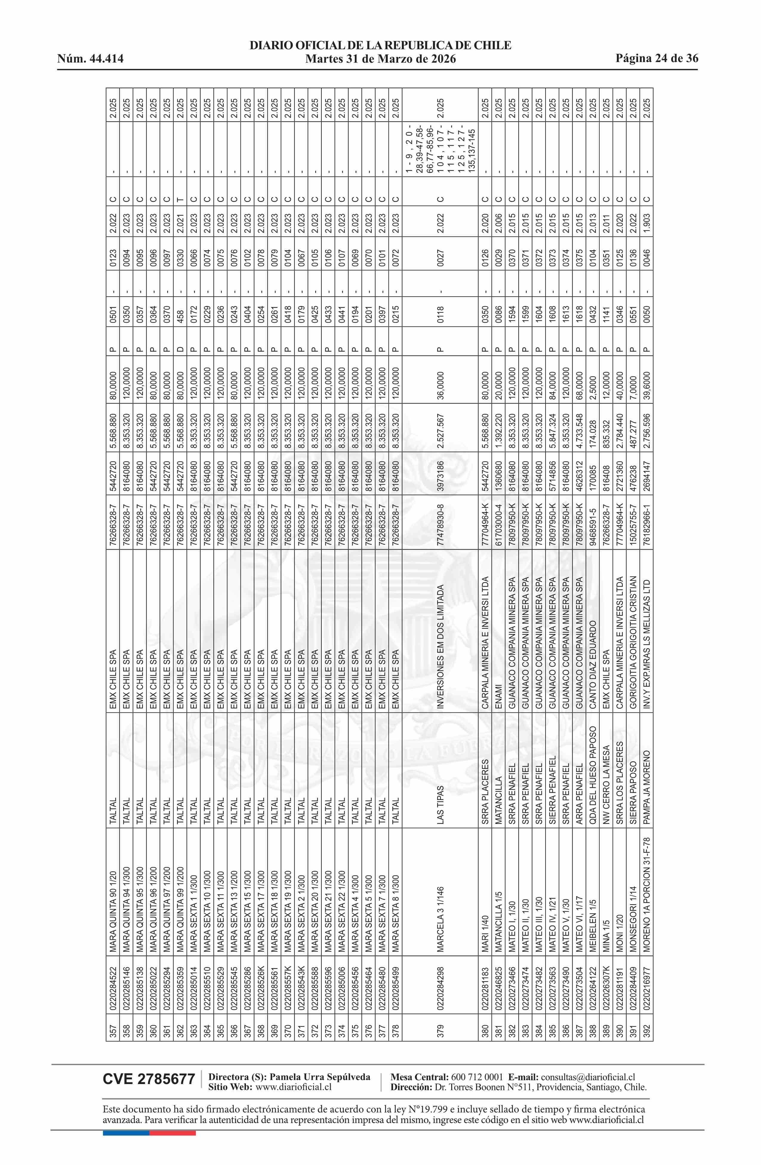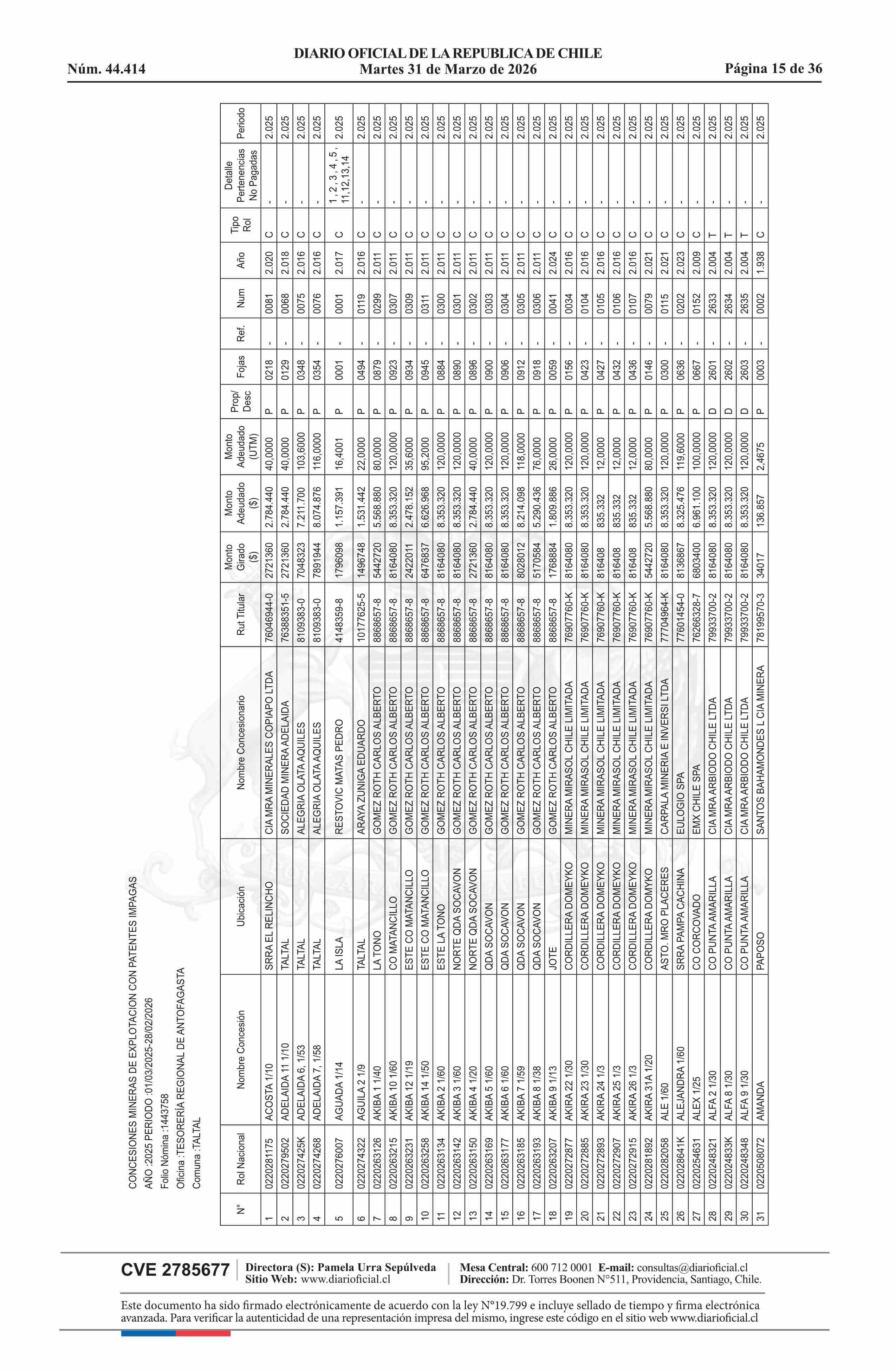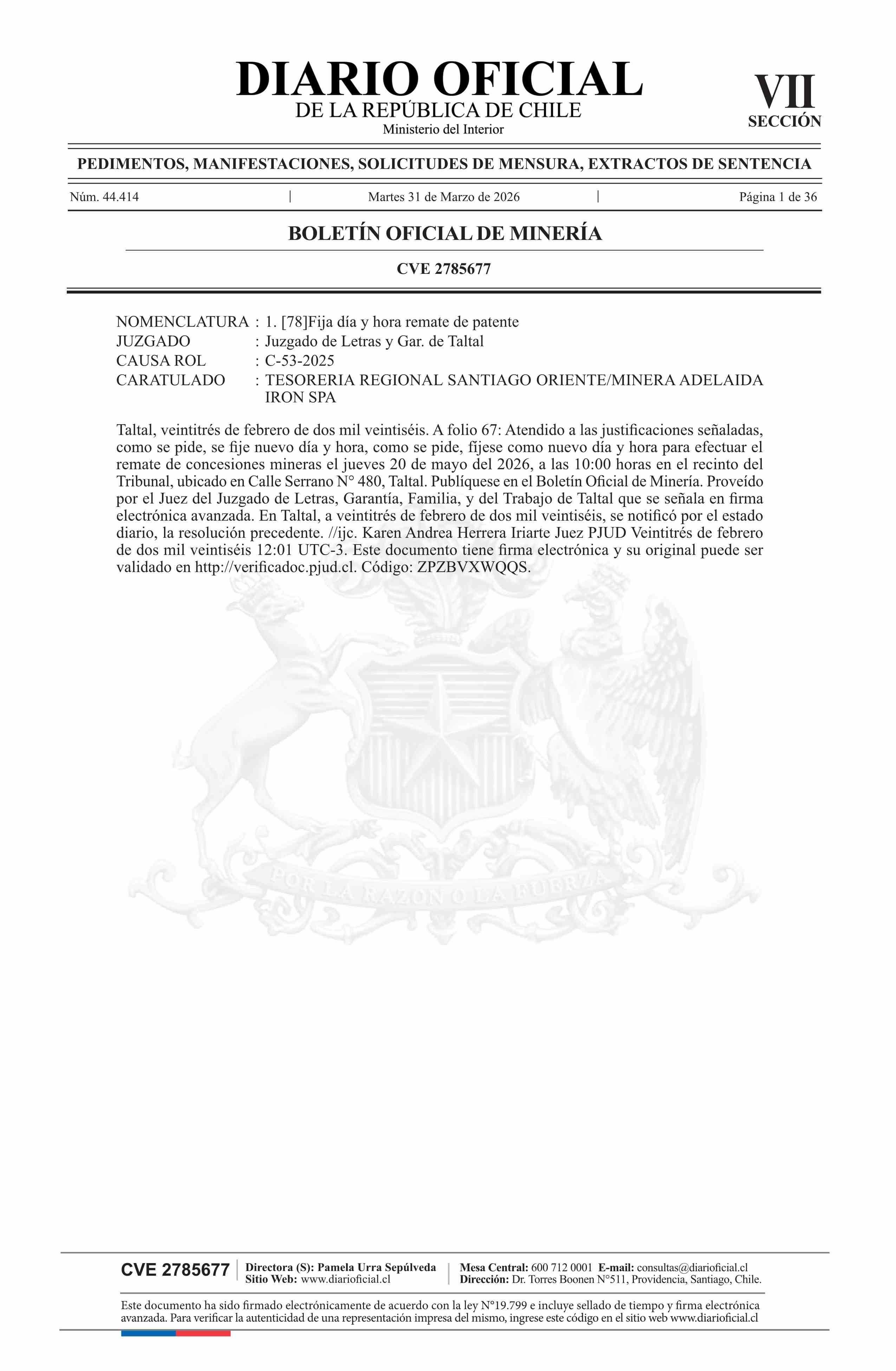 Remate de pertenencias mineras: Comuna de Taltal 31-03-2026 DIARIO OFICIAL CHILE - BOLETÍN OFICIAL DE MINERÍA |