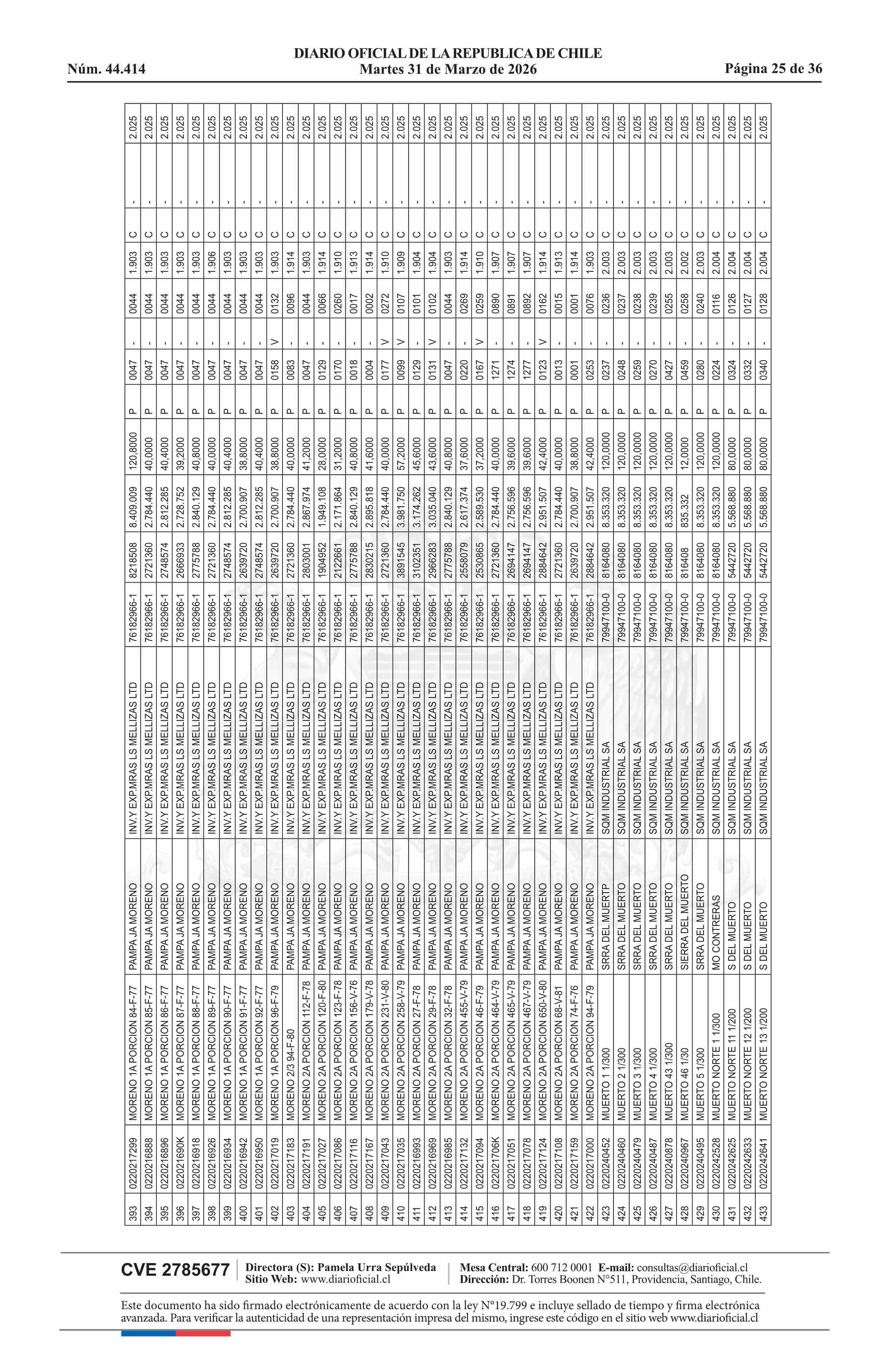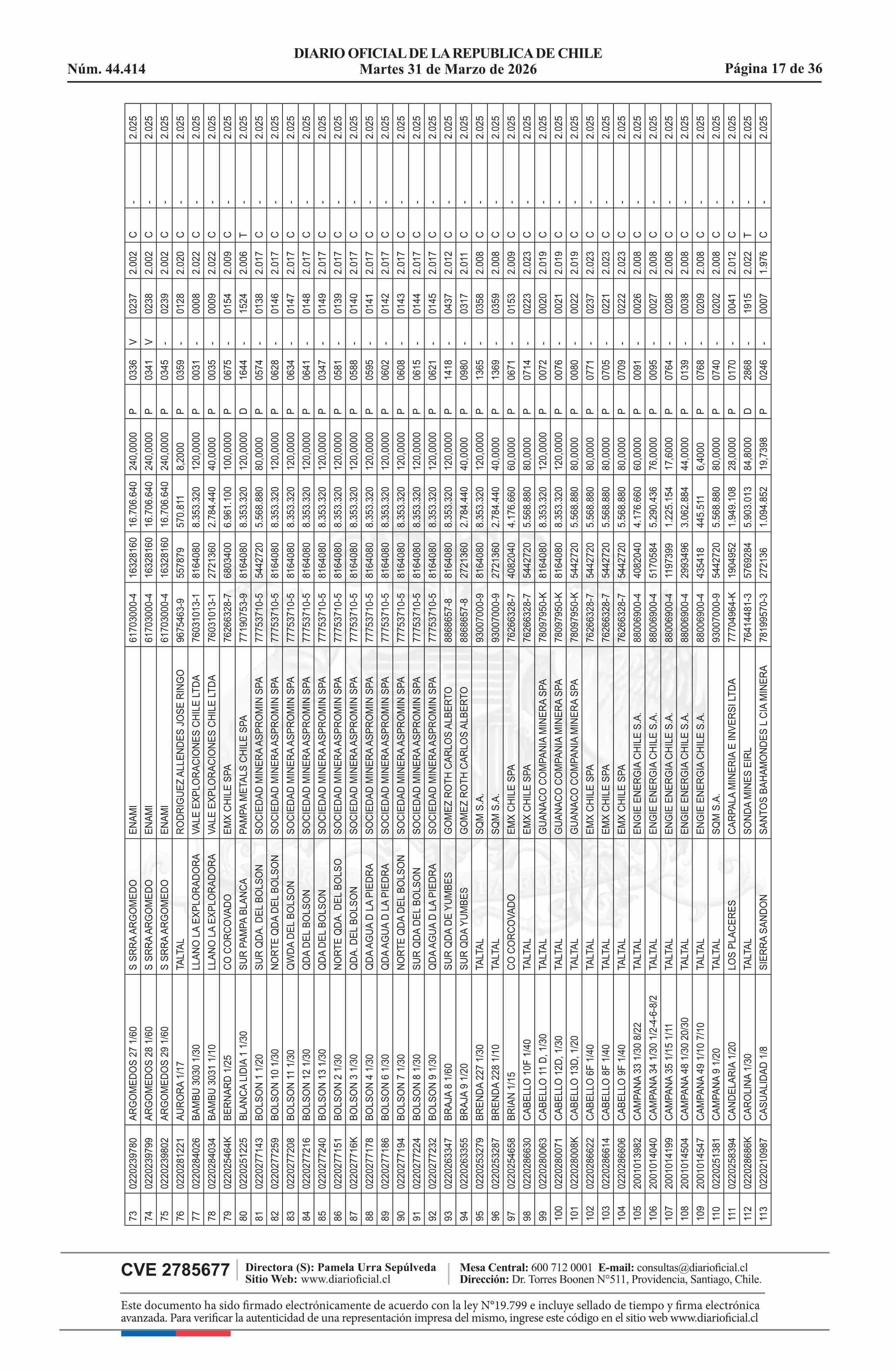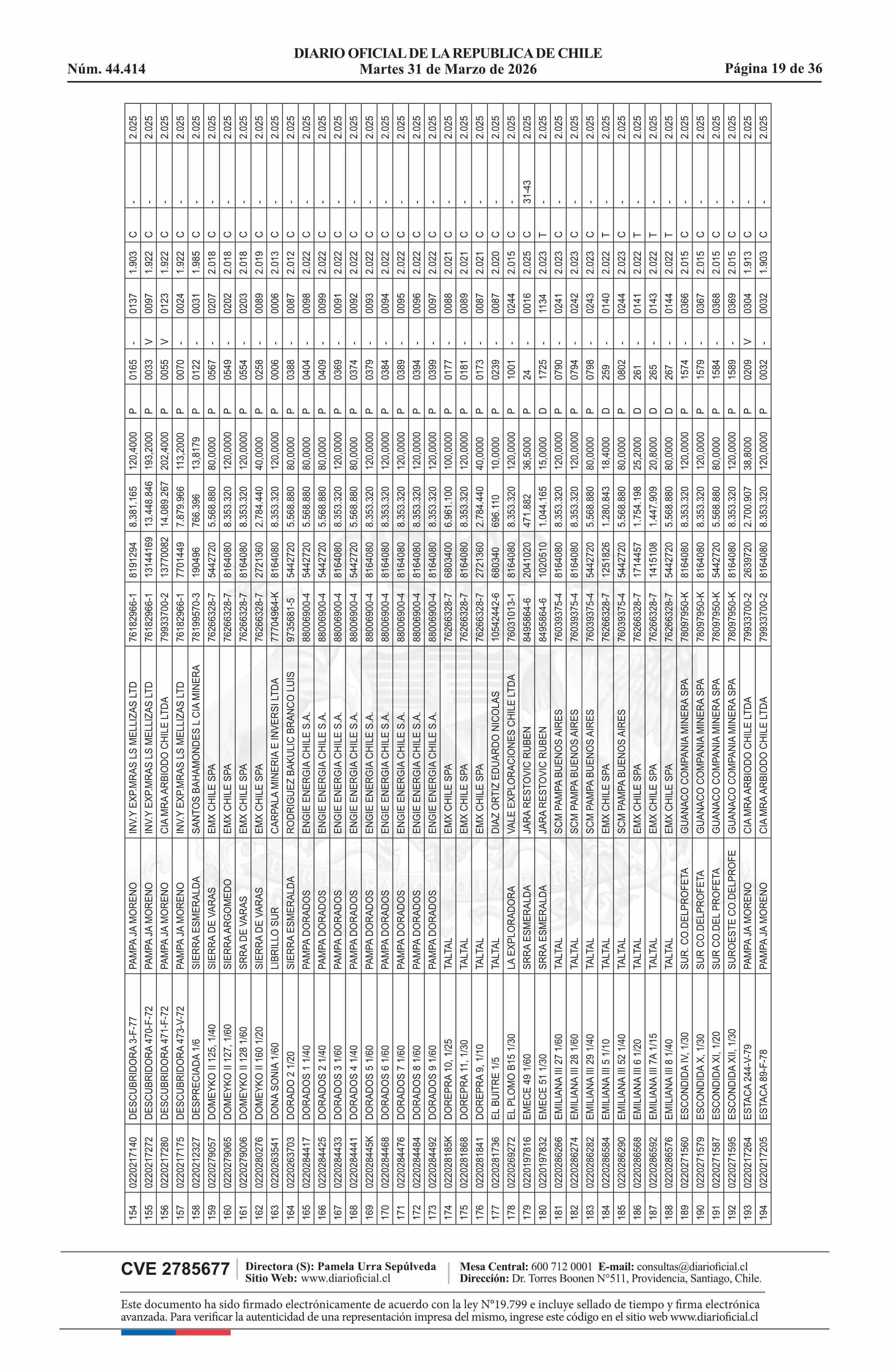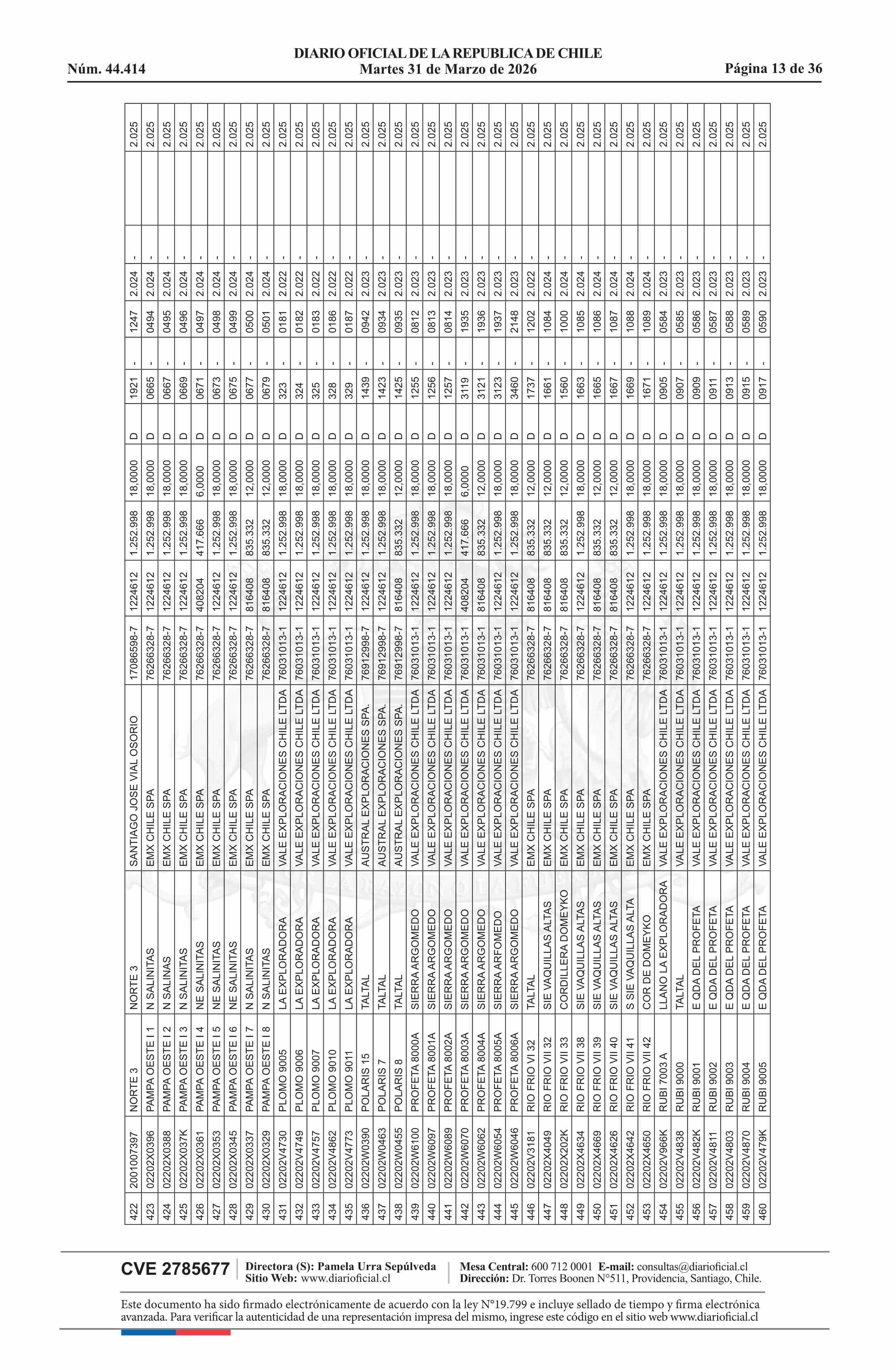 | Fuente: | DIARIO OFICIAL CHILE - BOLETÍN OFICIAL DE MINERÍA (DIARIO OFICIAL CHILE – BOM – NÓMINA REMATE) | Página(s): | 54-89 |