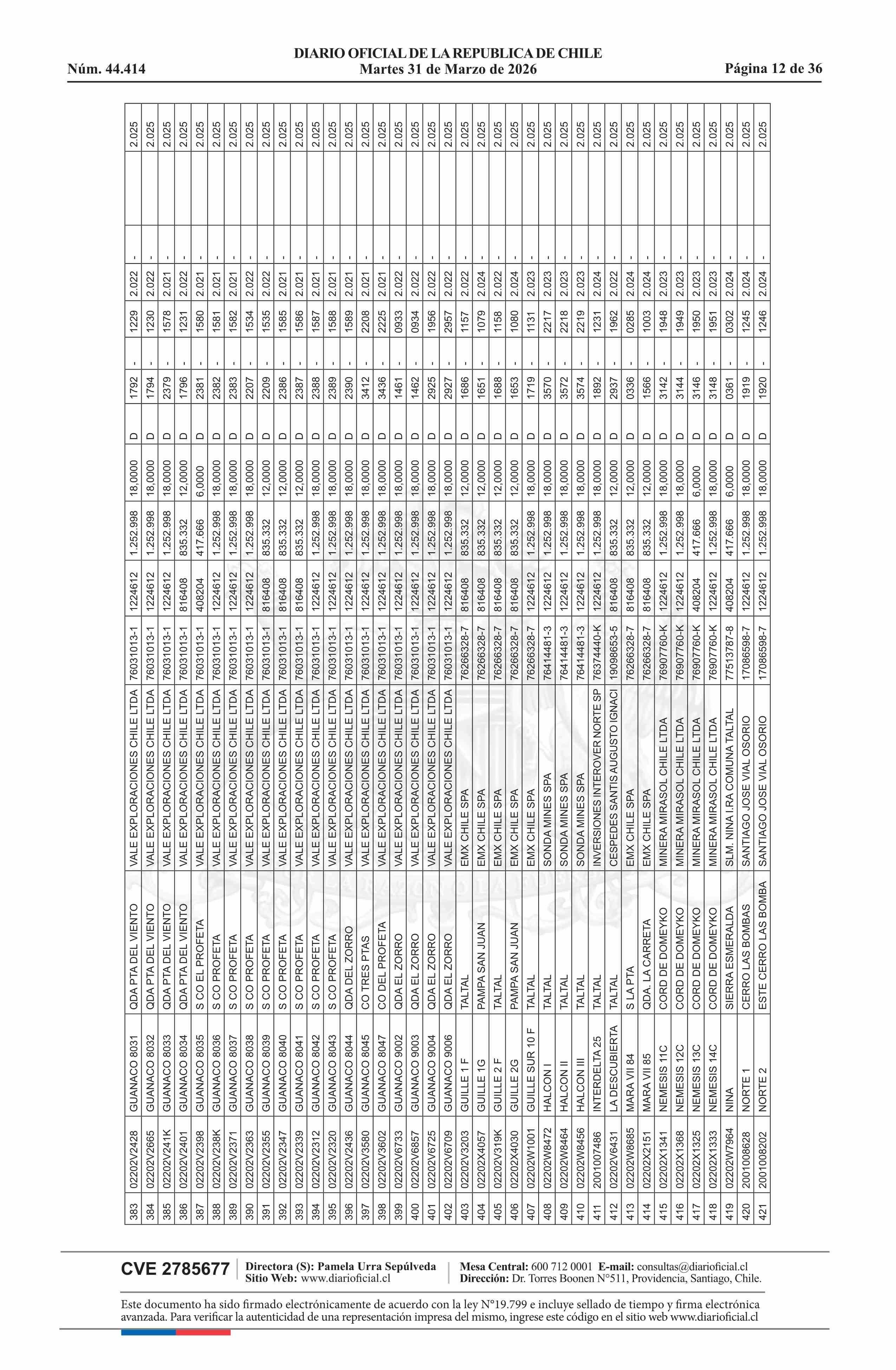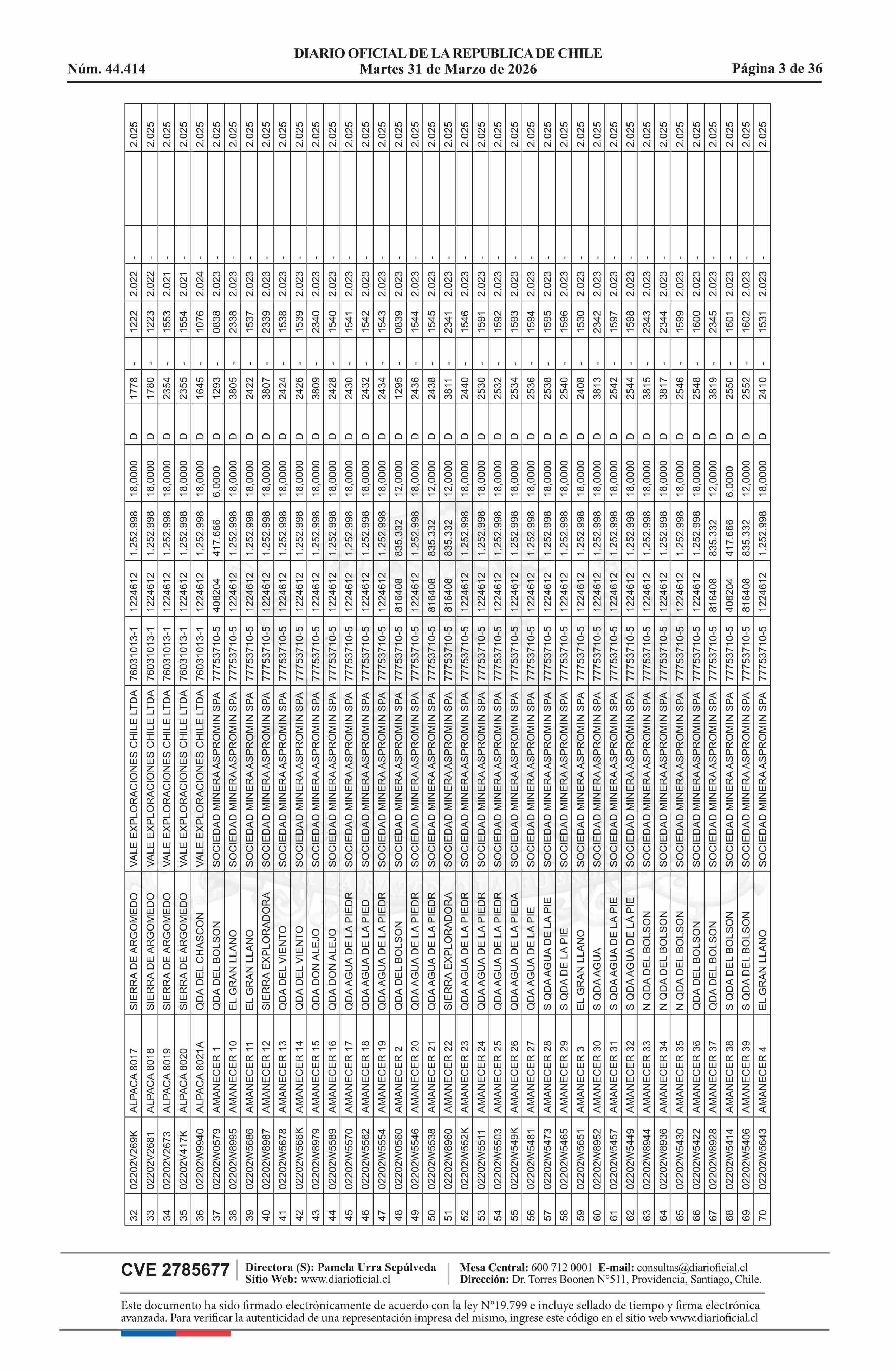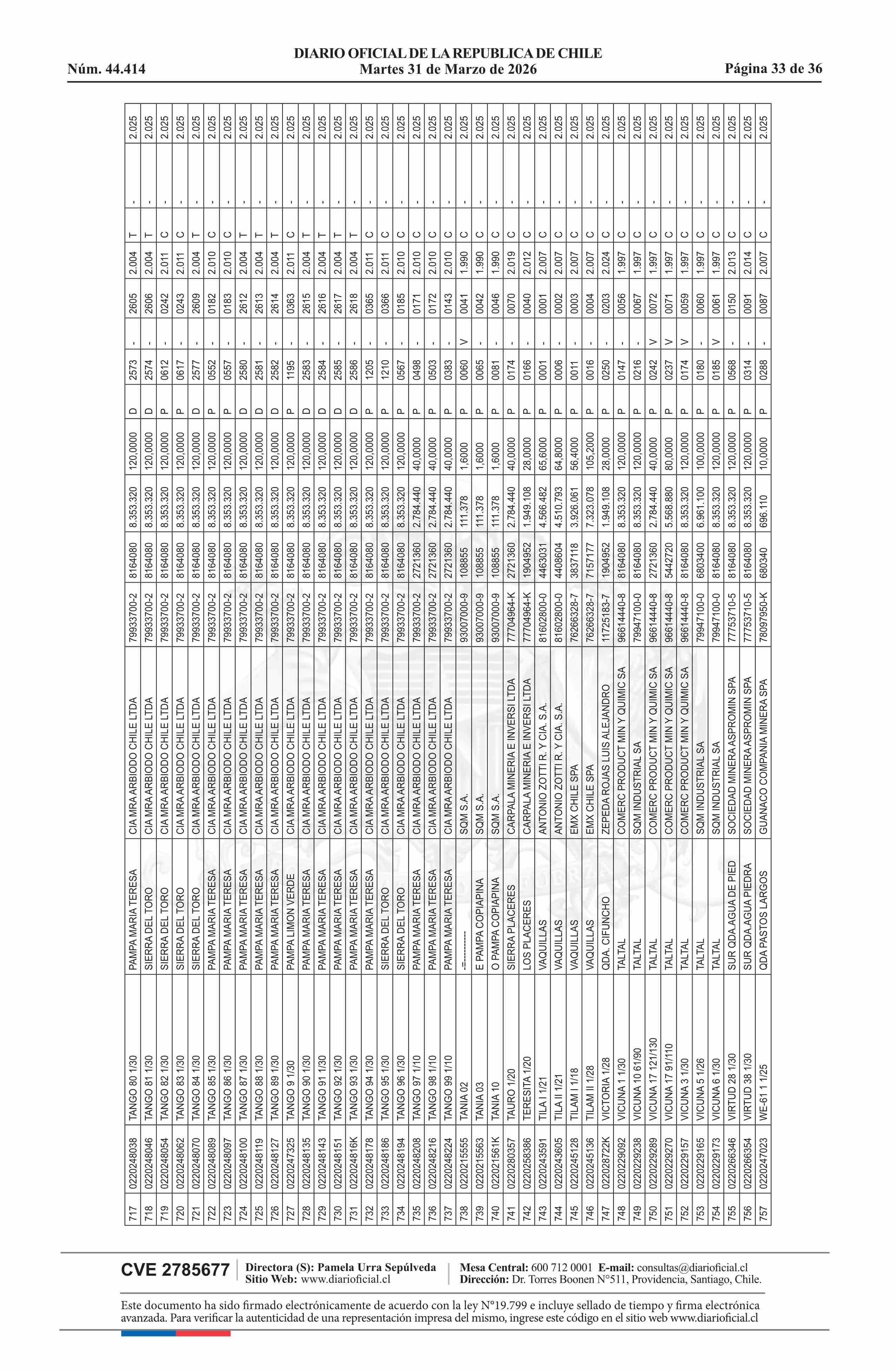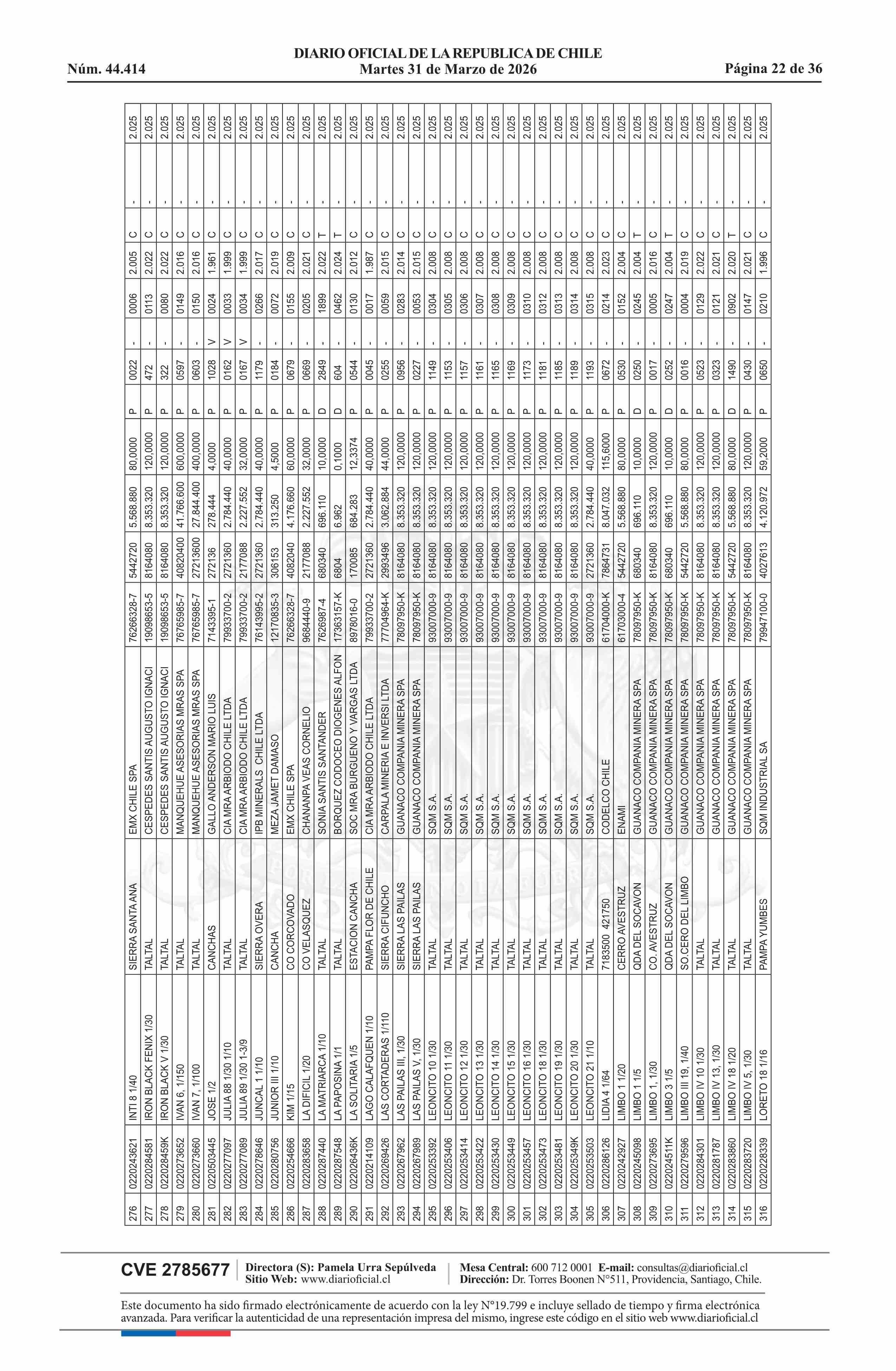 | Fuente: | DIARIO OFICIAL CHILE - BOLETÍN OFICIAL DE MINERÍA (DIARIO OFICIAL CHILE – BOM – NÓMINA REMATE) | Página(s): | 54-89 |