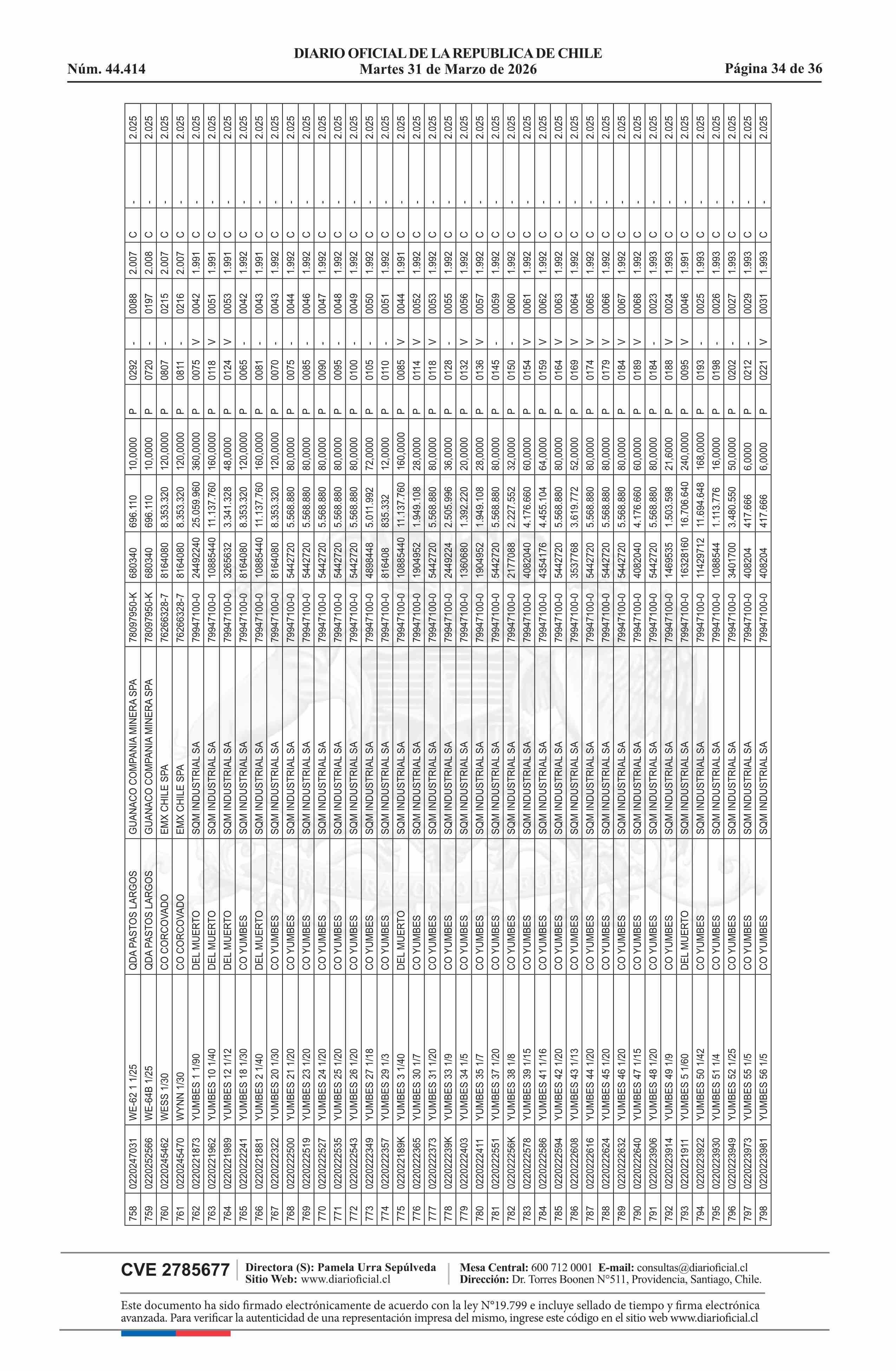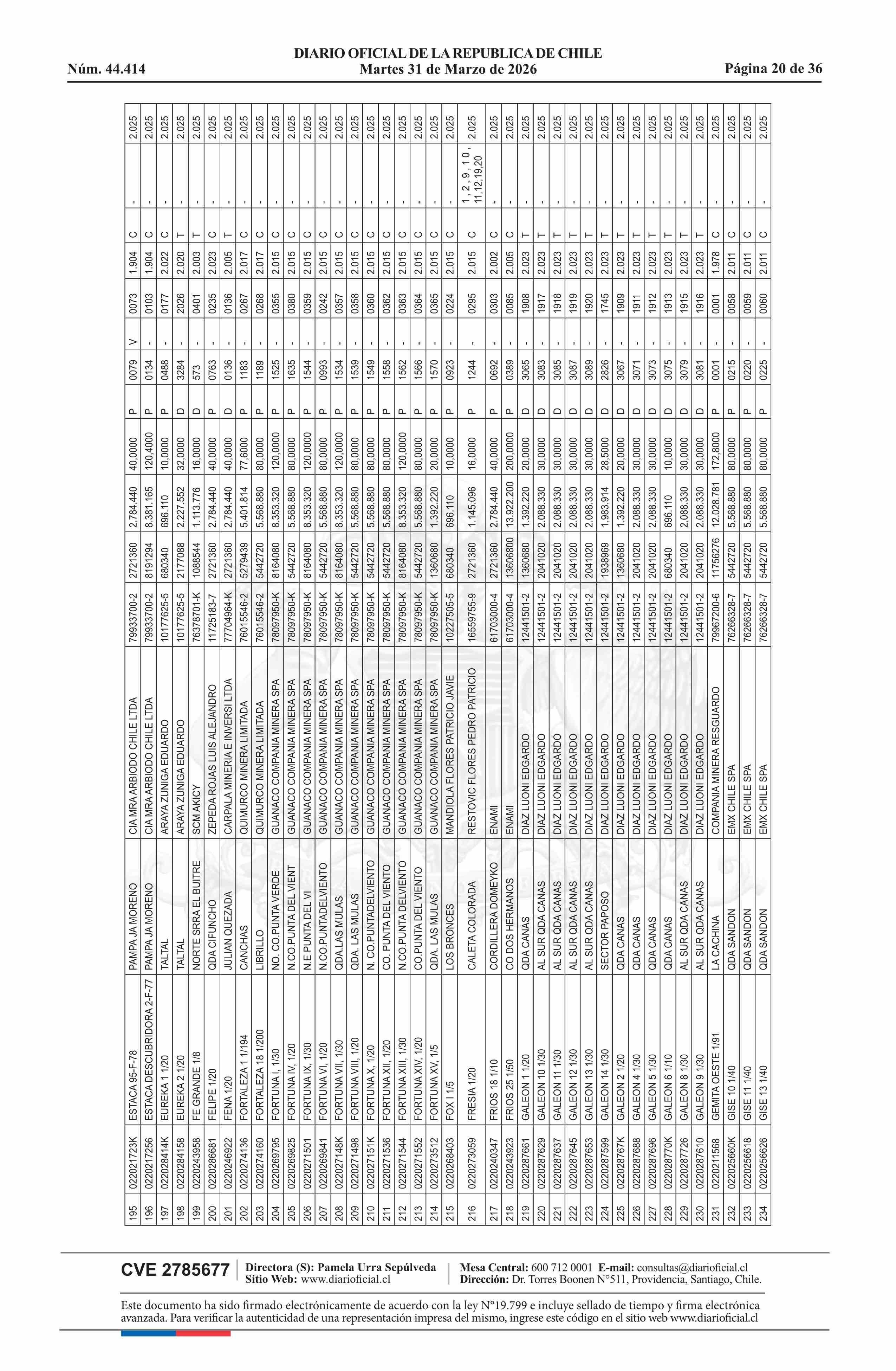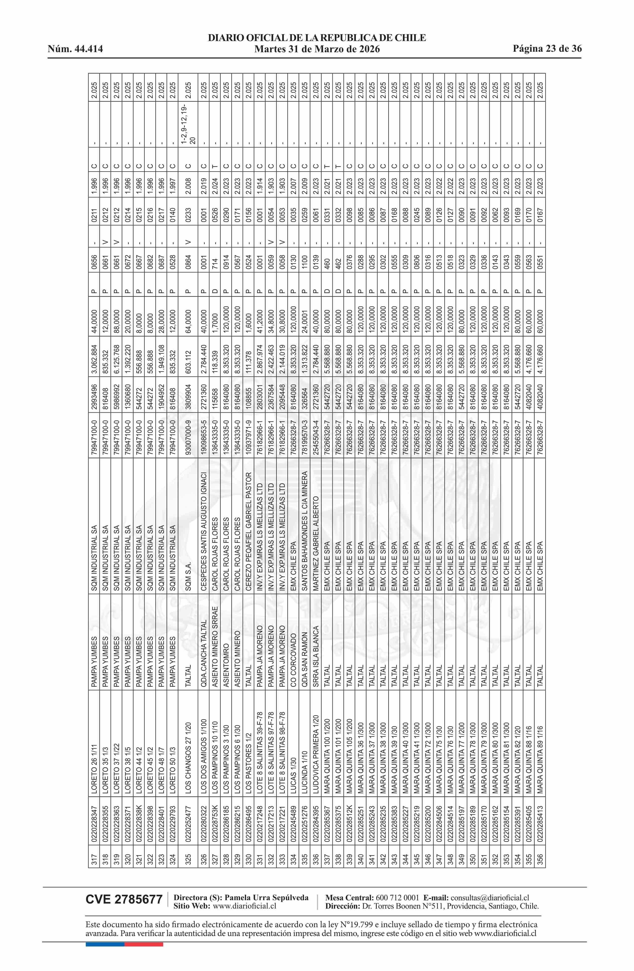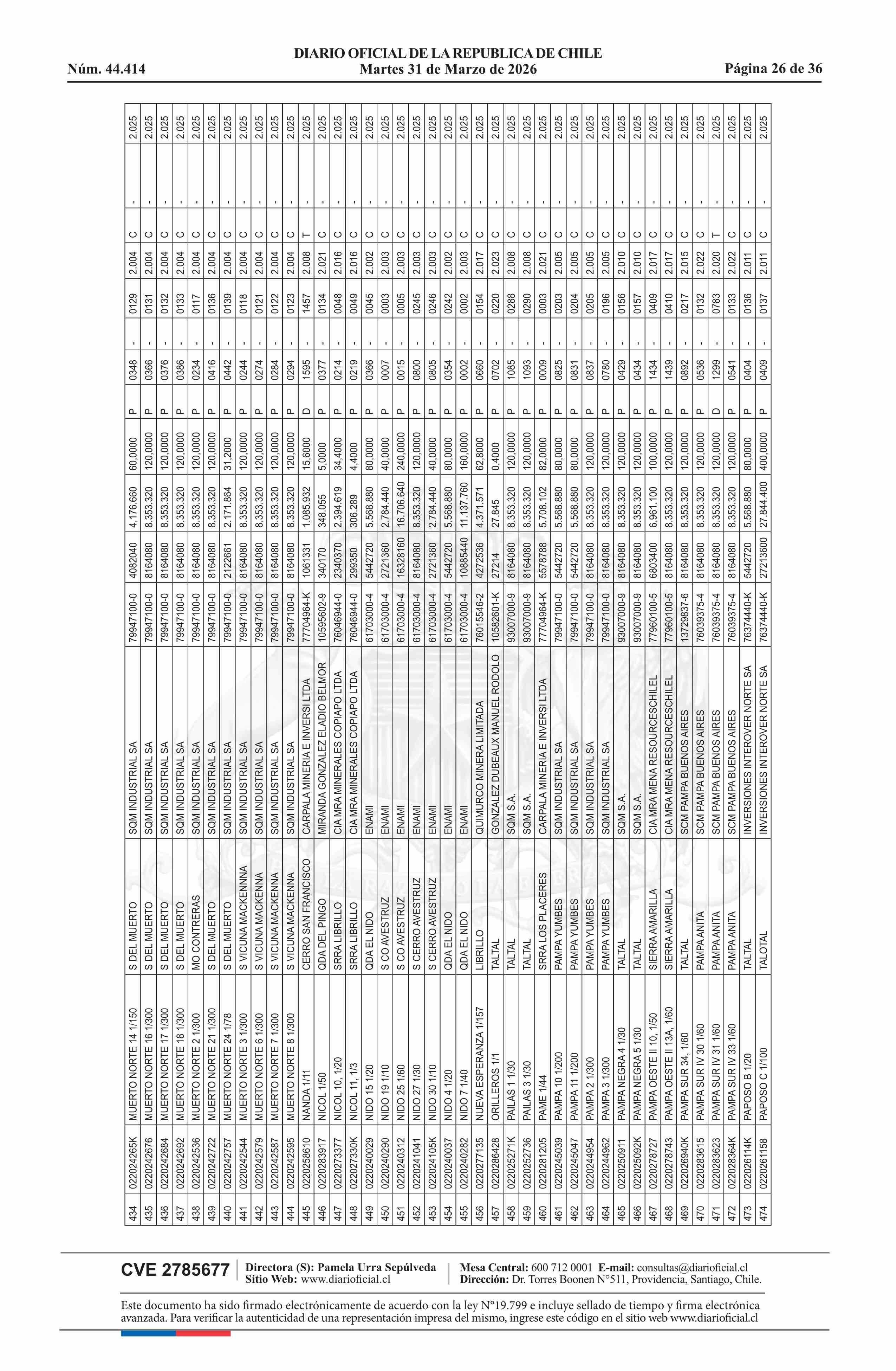 | Fuente: | DIARIO OFICIAL CHILE - BOLETÍN OFICIAL DE MINERÍA (DIARIO OFICIAL CHILE – BOM – NÓMINA REMATE) | Página(s): | 54-89 |
