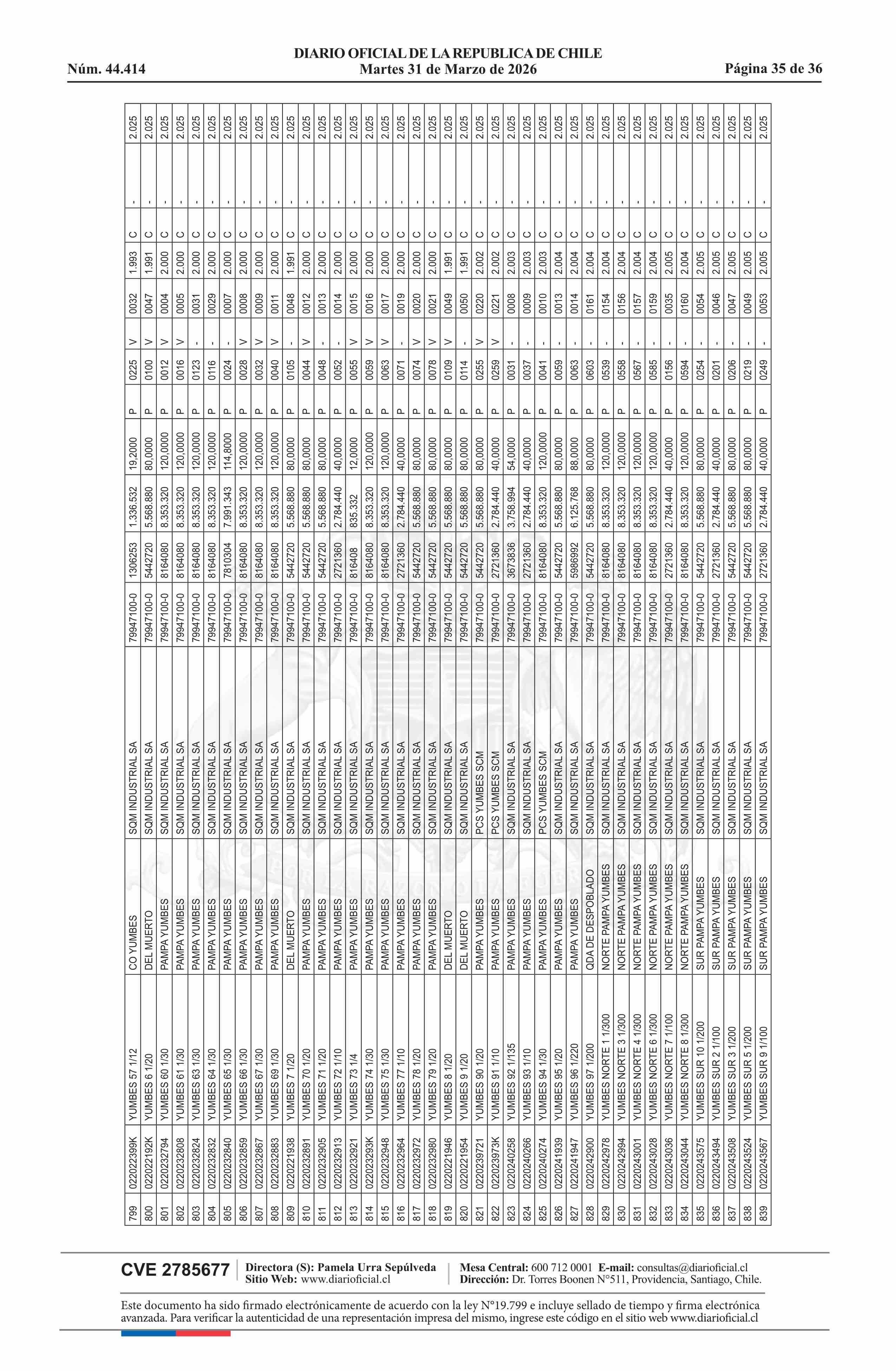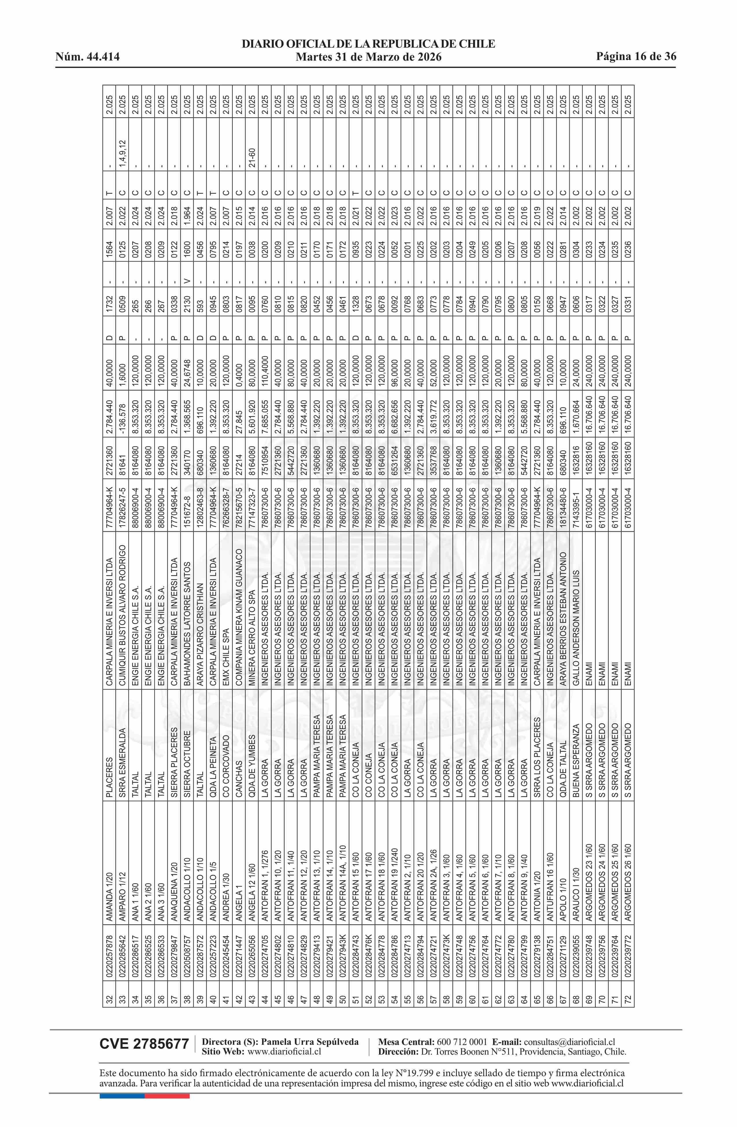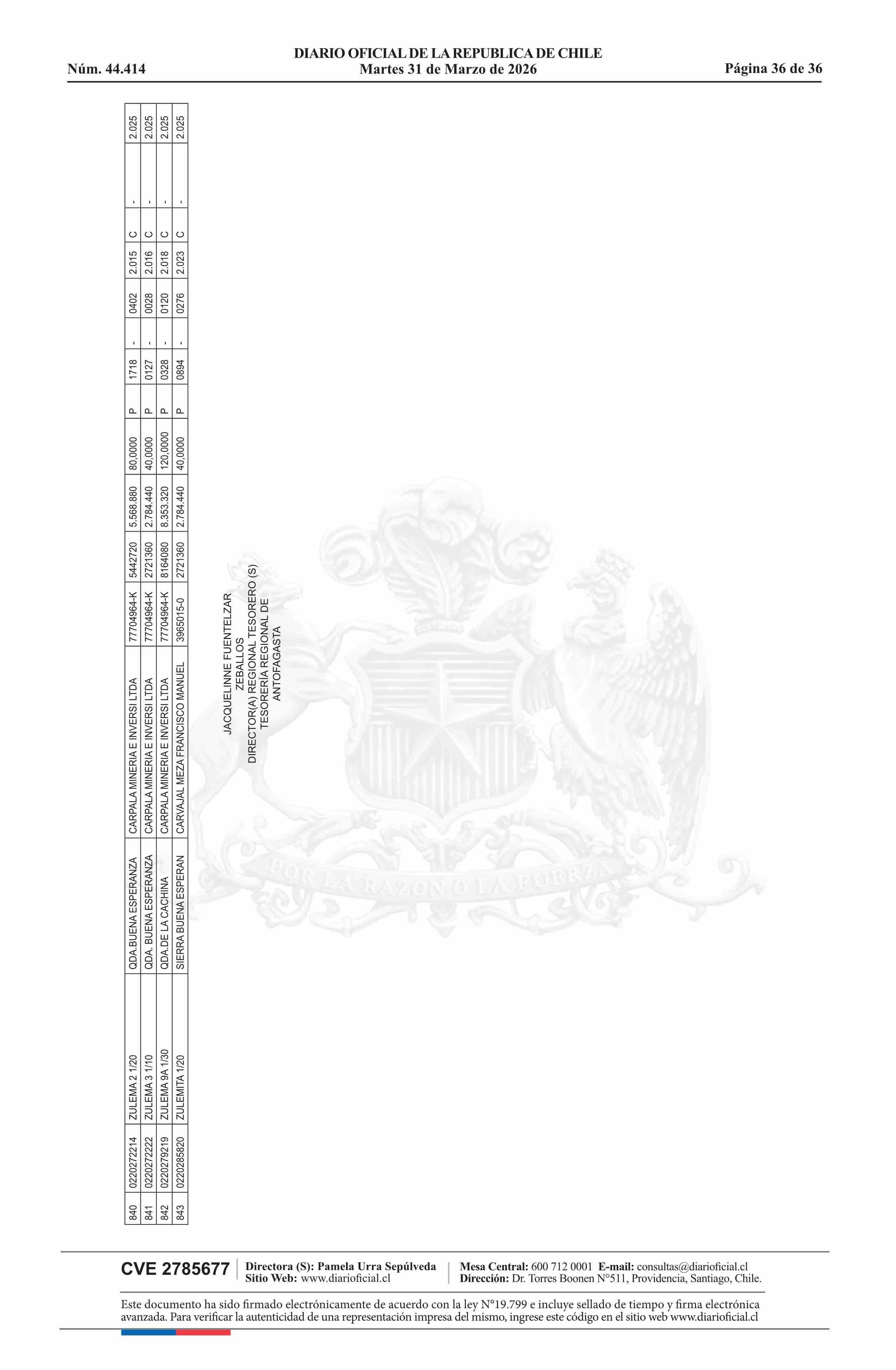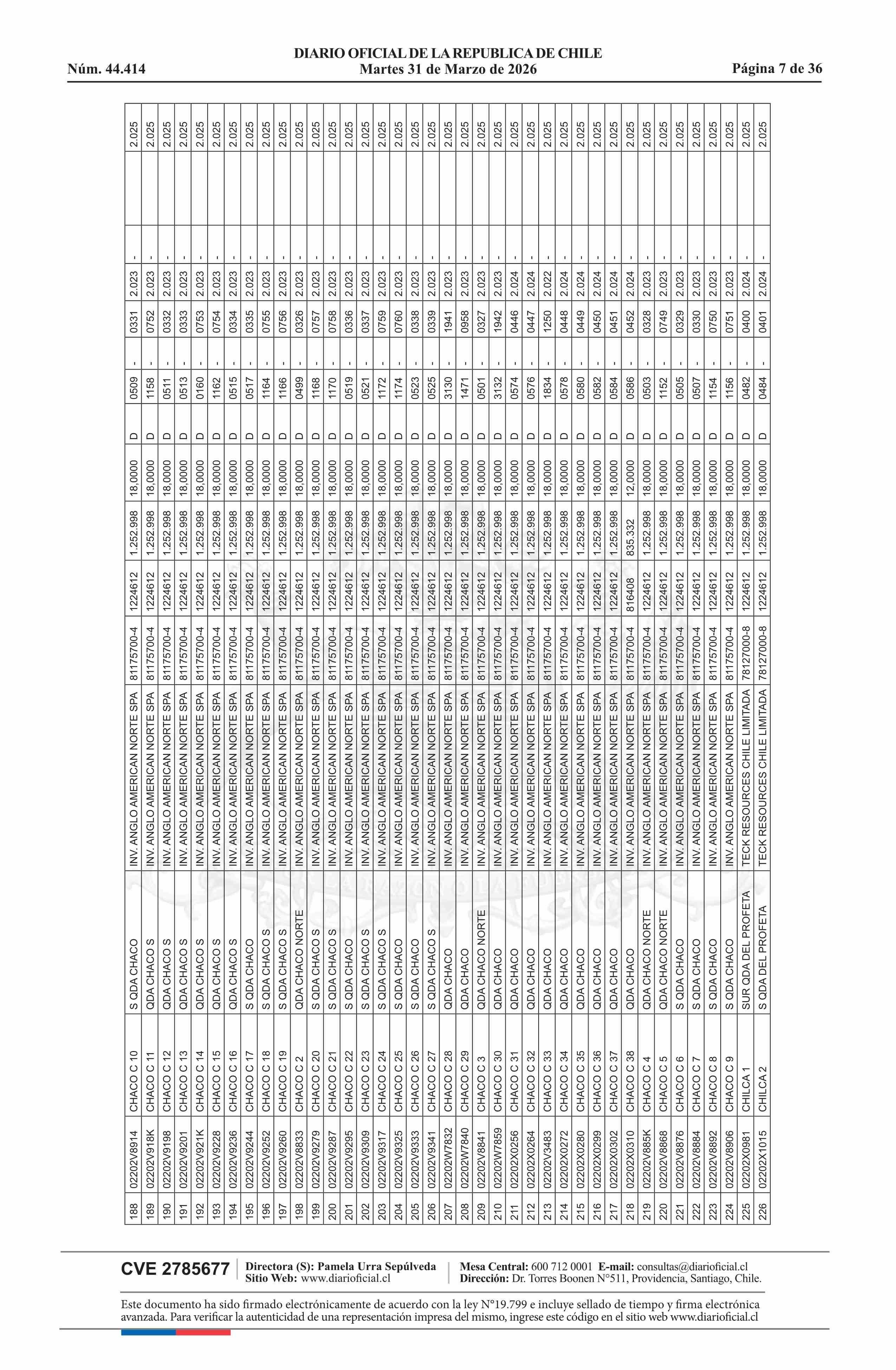 | Fuente: | DIARIO OFICIAL CHILE - BOLETÍN OFICIAL DE MINERÍA (DIARIO OFICIAL CHILE – BOM – NÓMINA REMATE) | Página(s): | 54-89 |