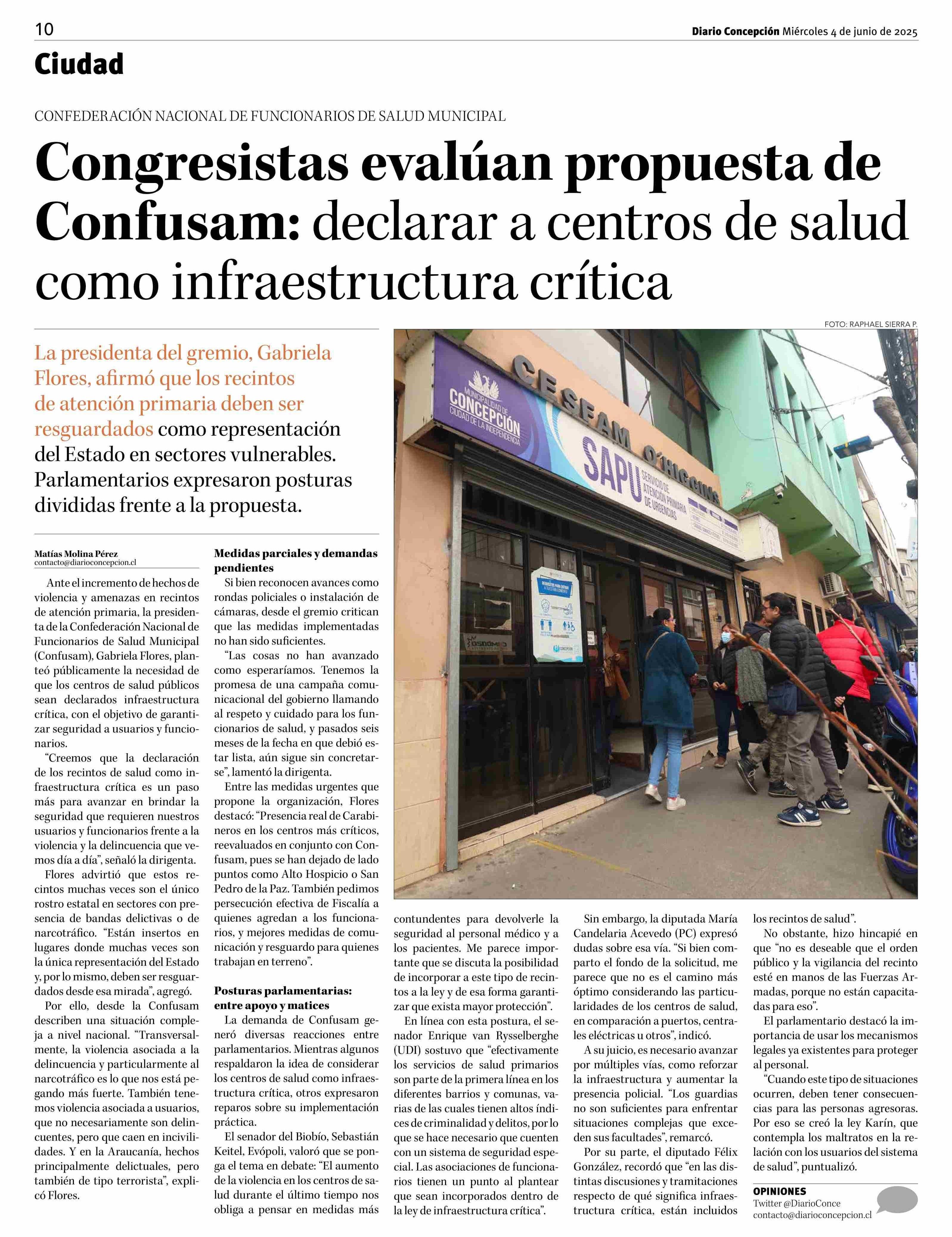 Congresistas evalúan propuesta de Confusam: declarar a centros de salud como infraestructura crítica 04-06-2025 Diario Concepción |
