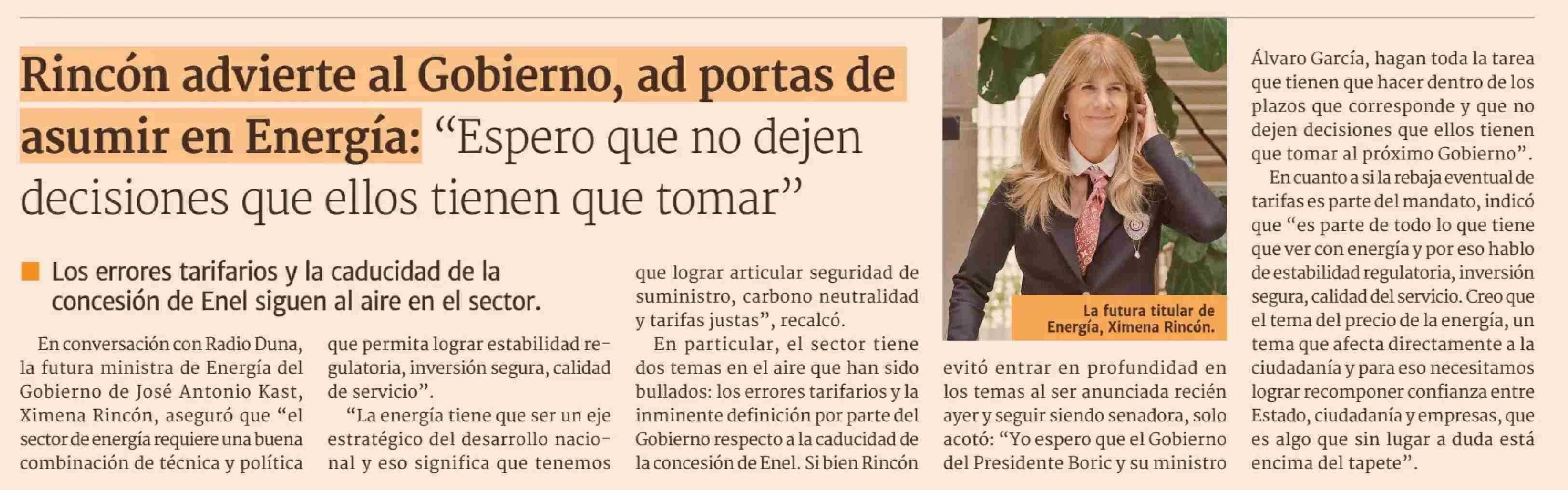 Título: Rincón advierte al Gobierno, ad portas de asumir en Energía: "Espero que no dejen decisiones que ellos tienen que tomar"