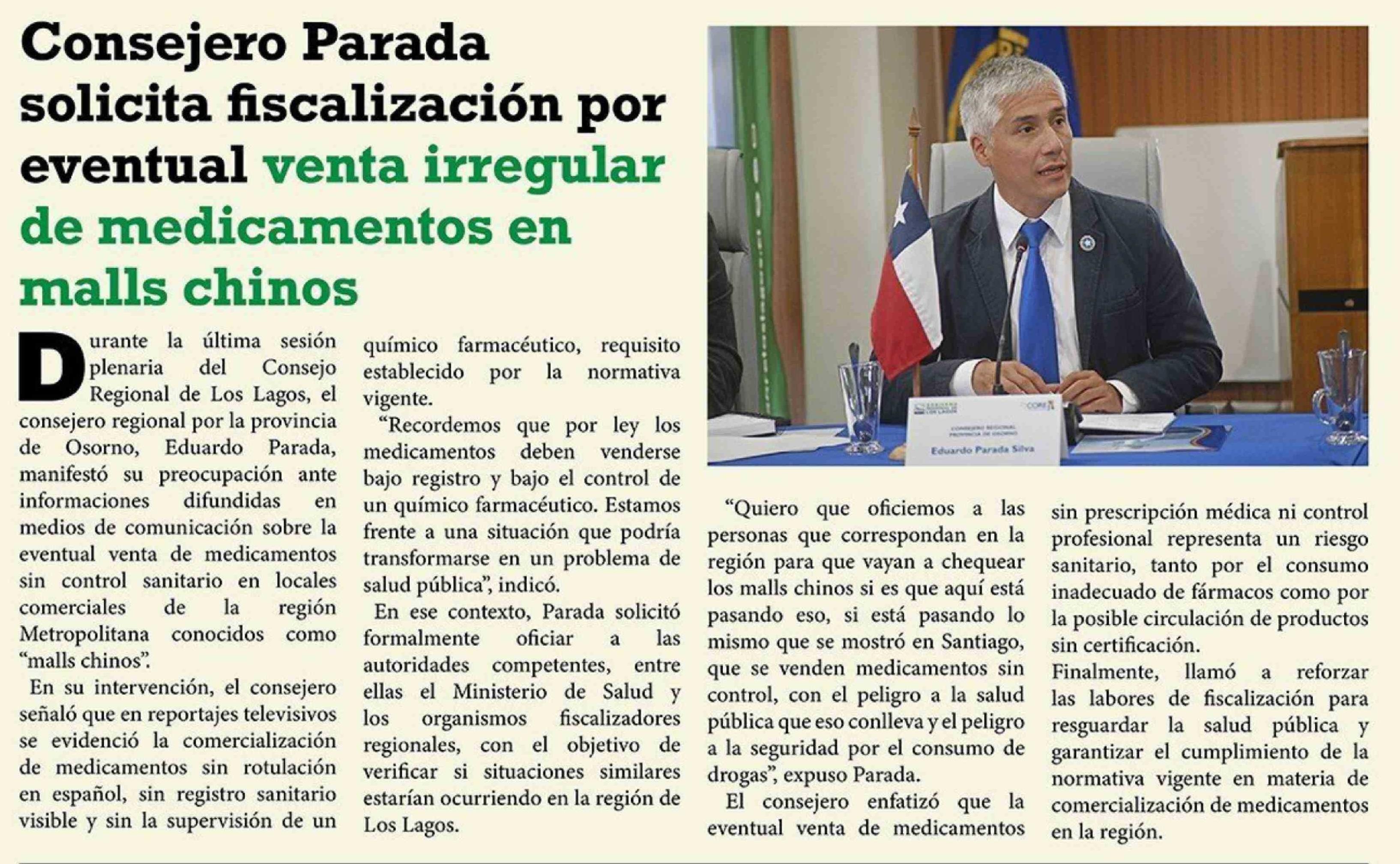 Título: Consejero Parada solicita fiscalización por eventual venta irregular de medicamentos en malls chinos