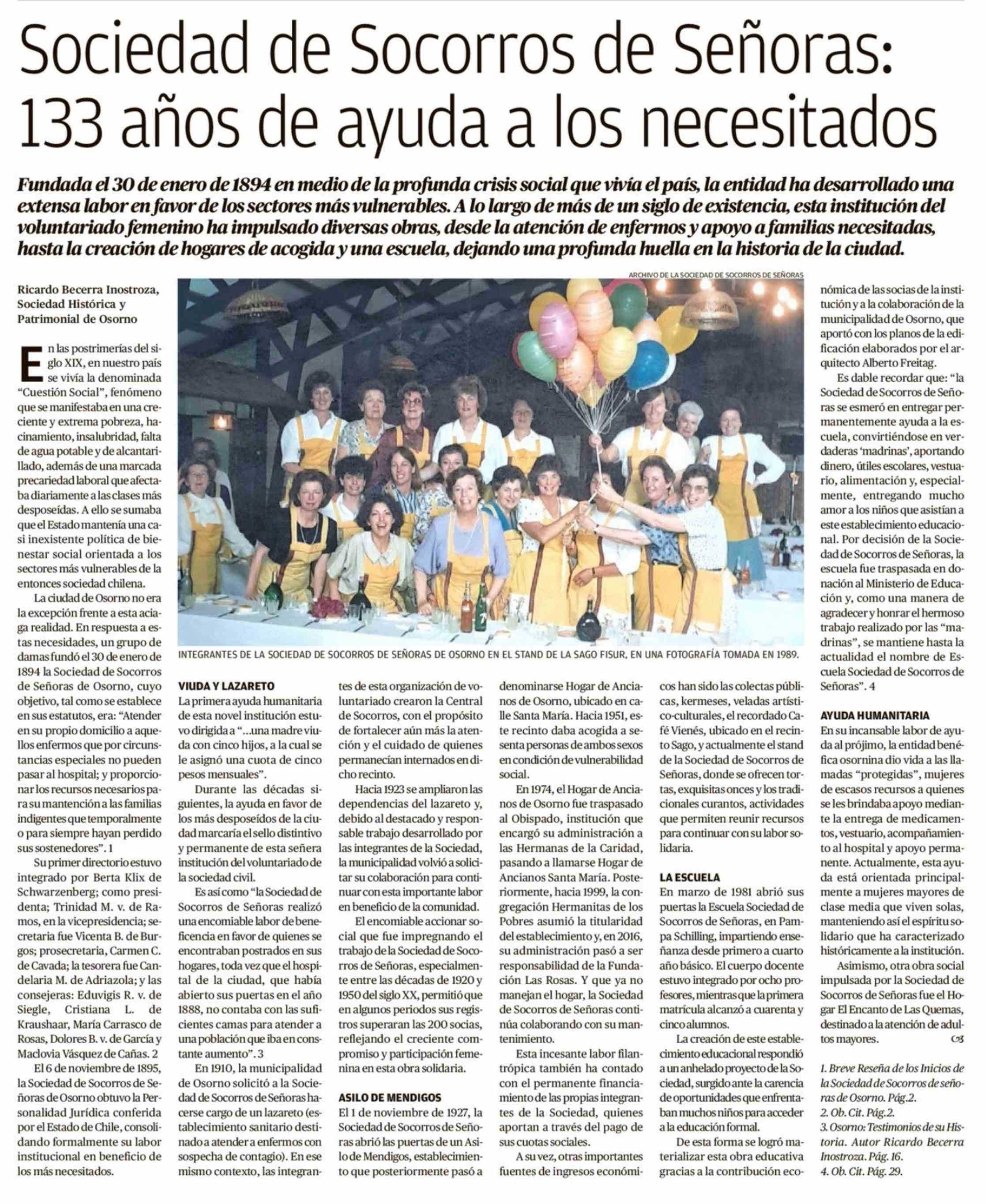 Sociedad de Socorros de Señoras: 133 años de ayuda a los necesitados 15-03-2026 El Austral de Osorno |