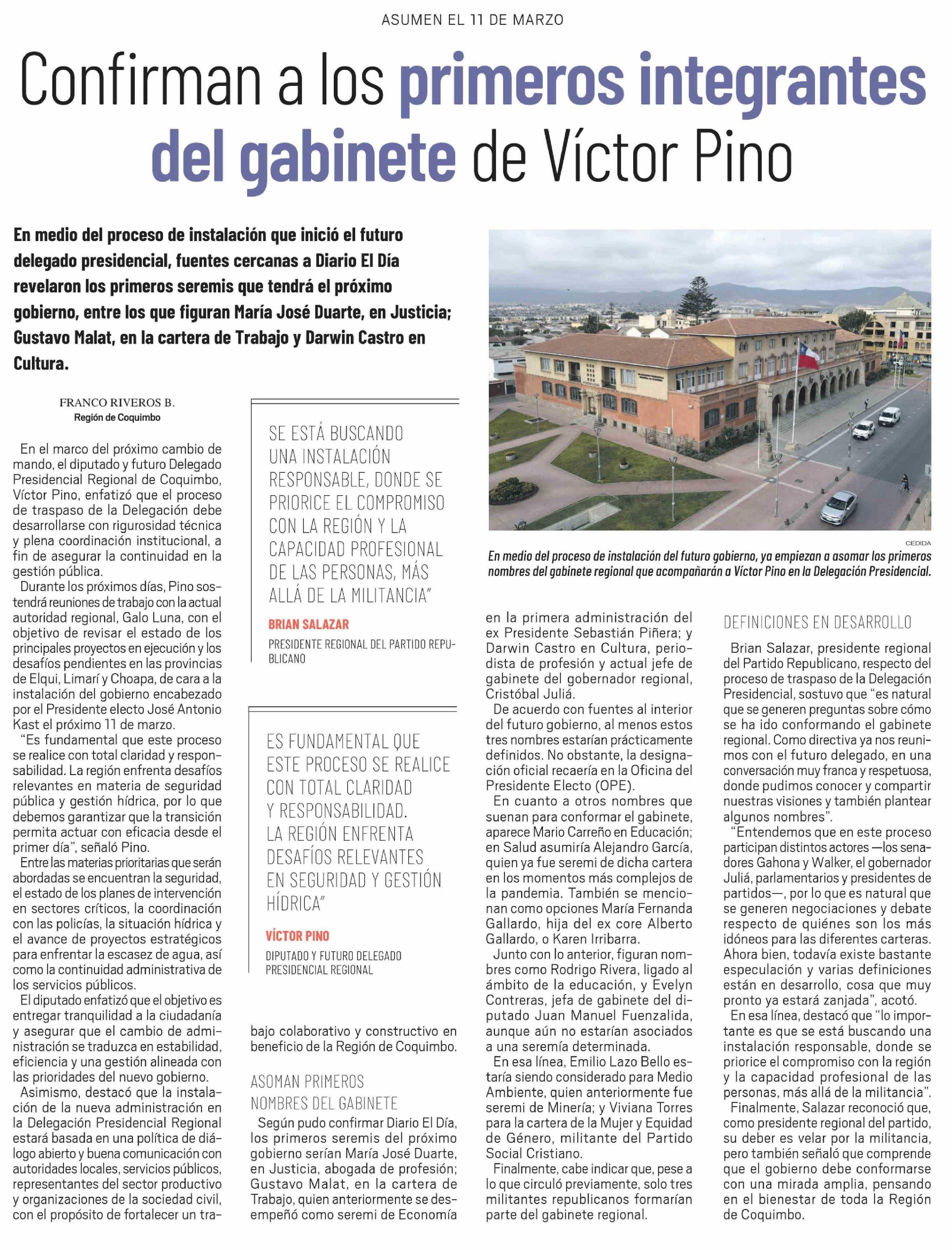 | Título: | Confirman a los primeros integrantes del gabinete de Víctor Pino |