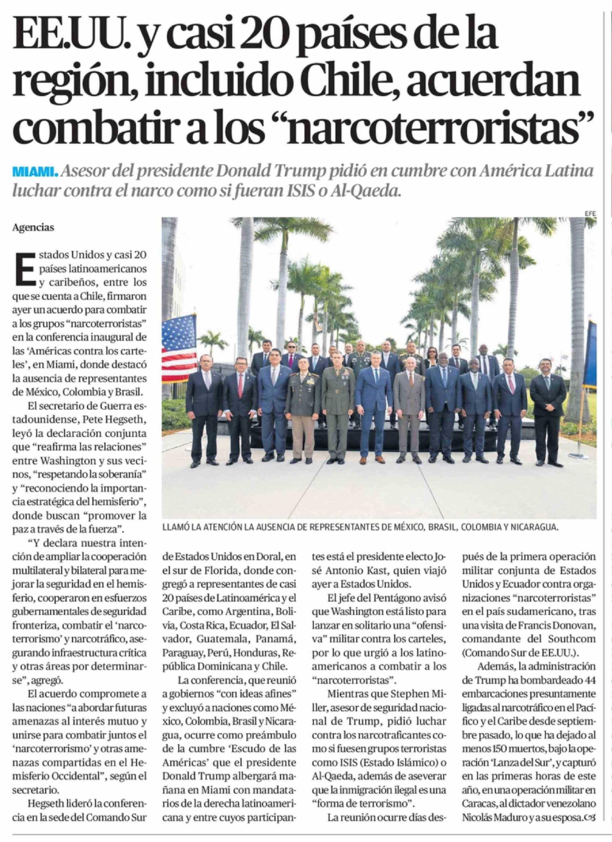 EE.UU. y casi 20 países de la región, incluido Chile, acuerdan combatir a los "narcoterroristas" 06-03-2026 El Mercurio de Antofagasta |