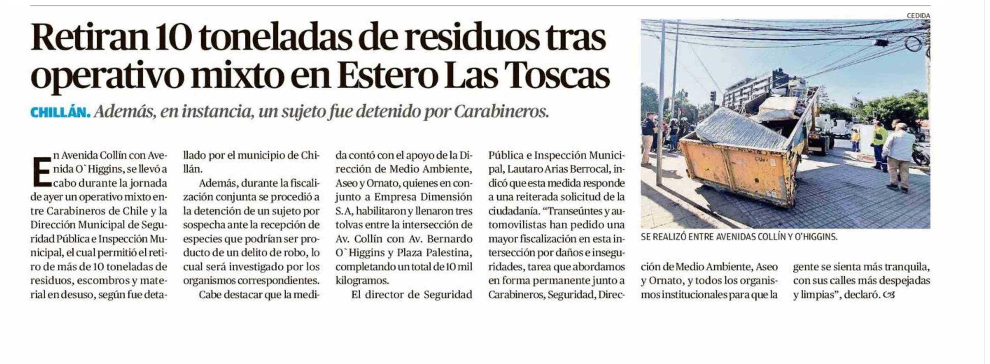 Retiran 10 toneladas de residuos tras operativo mixto en Estero Las Toscas 30-01-2026 Crónica de Chillán |