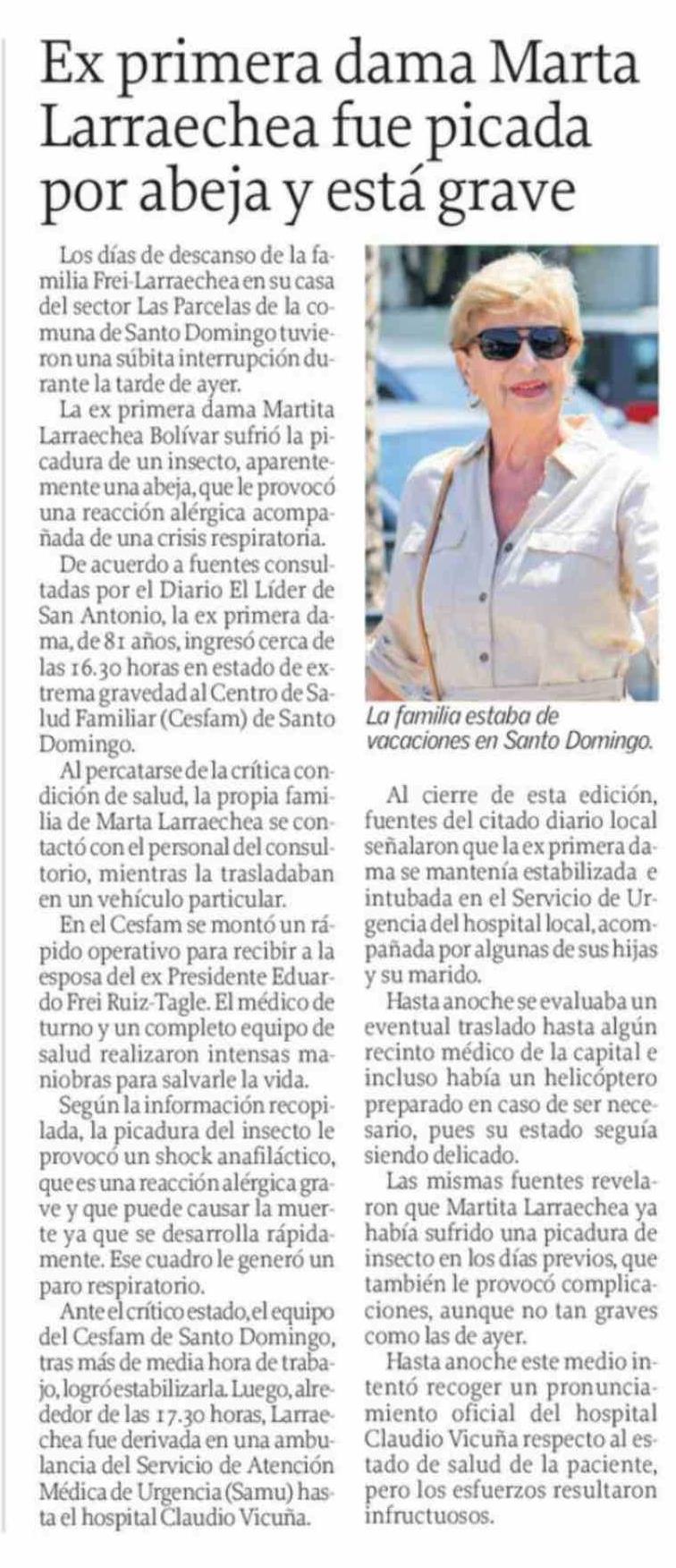 Título: Ex primera dama Marta Larraechea fue picada por abeja y está grave