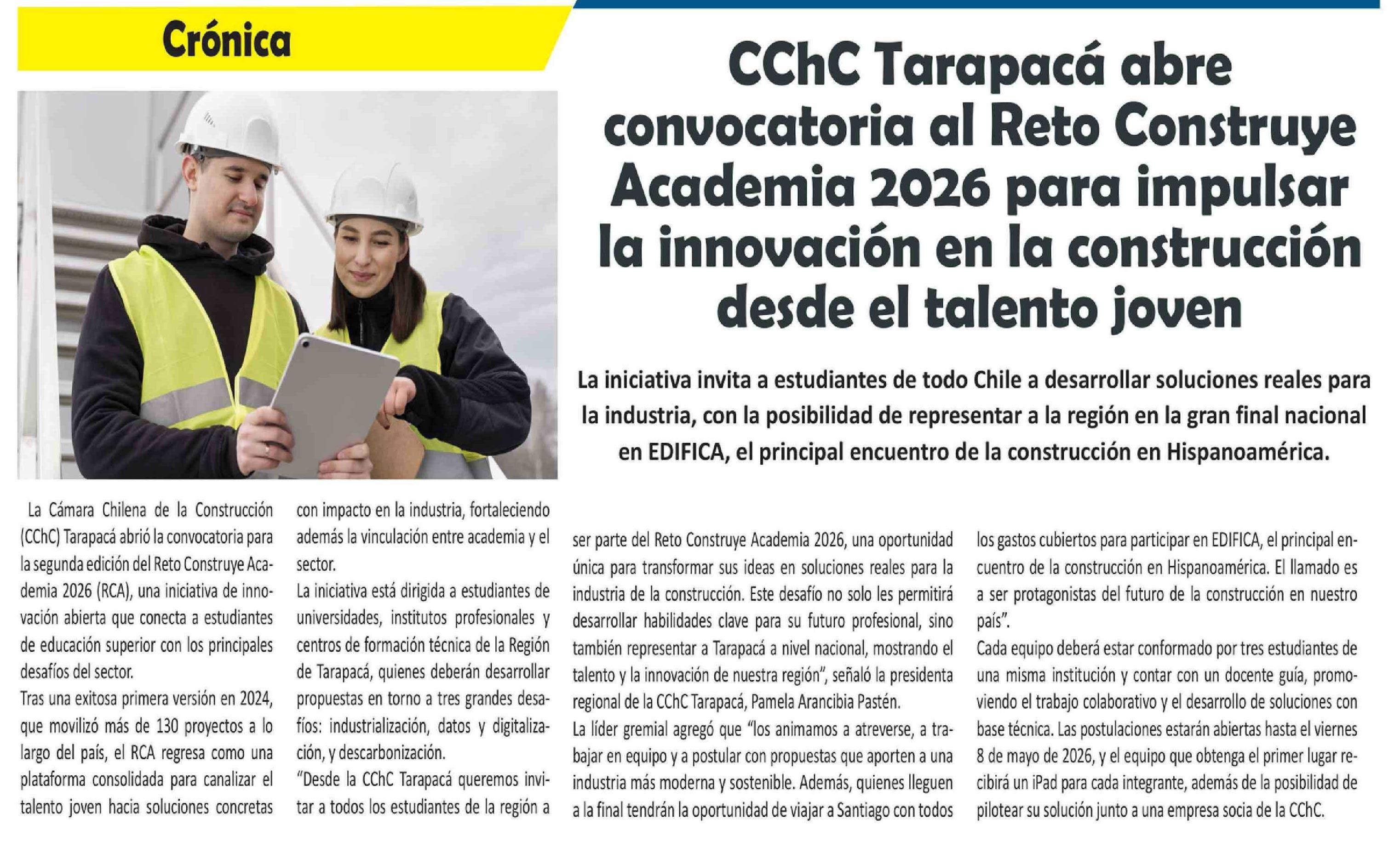 Título: CChC Tarapacá abre convocatoria al Reto Construye Academia 2026 para impulsar la innovación en la construcción desde el talento joven
