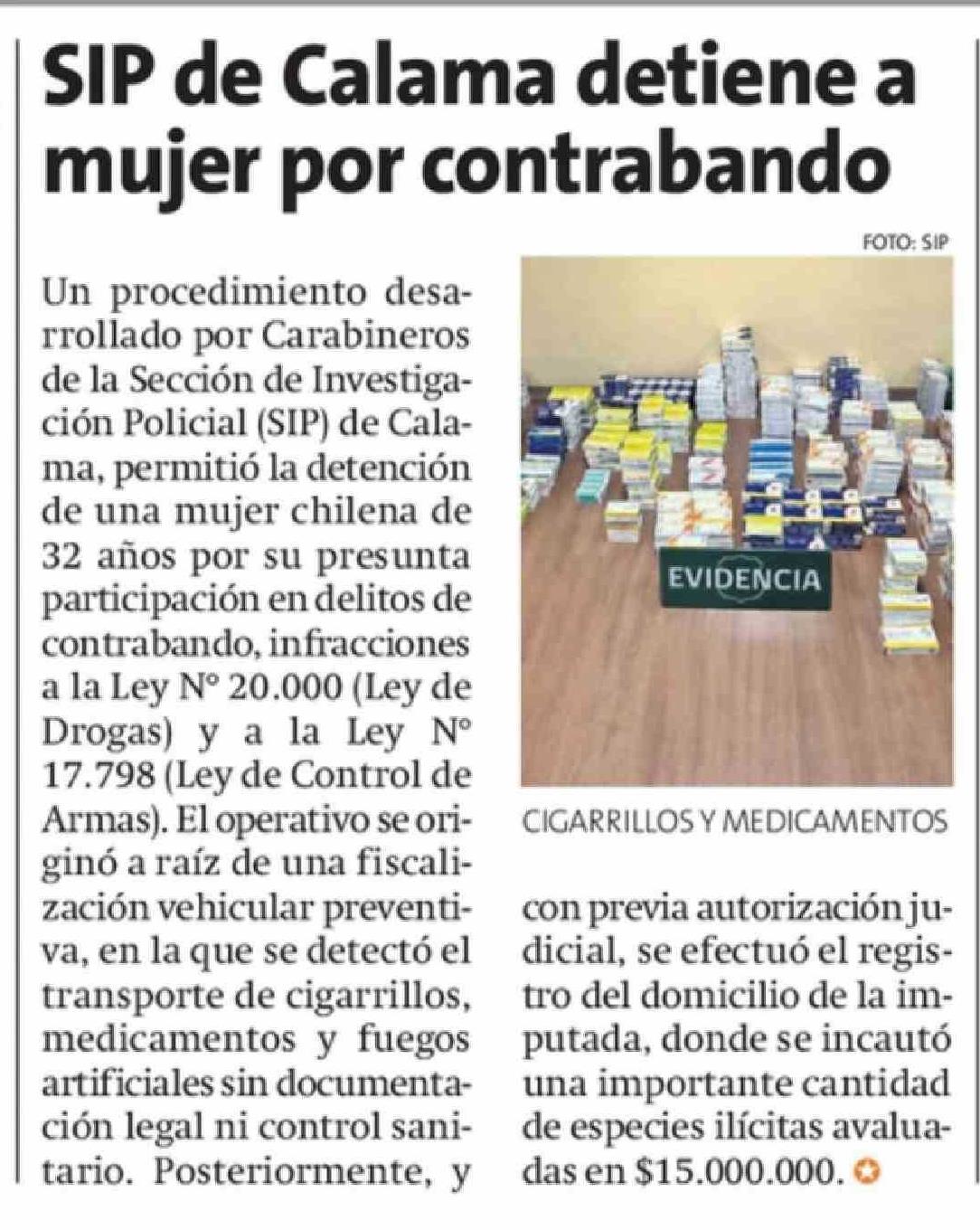 | Título: | SIP de Calama detiene a mujer por contrabando |