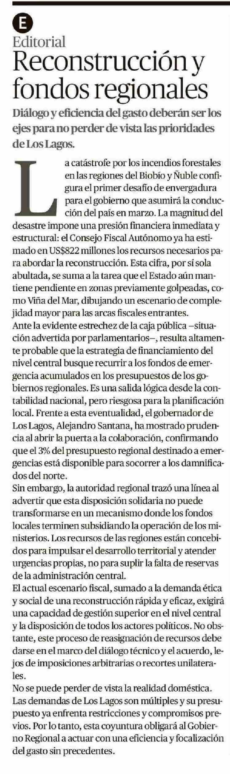 Editorial: Reconstrucción y fondos regionales 22-01-2026 El Austral de Osorno |