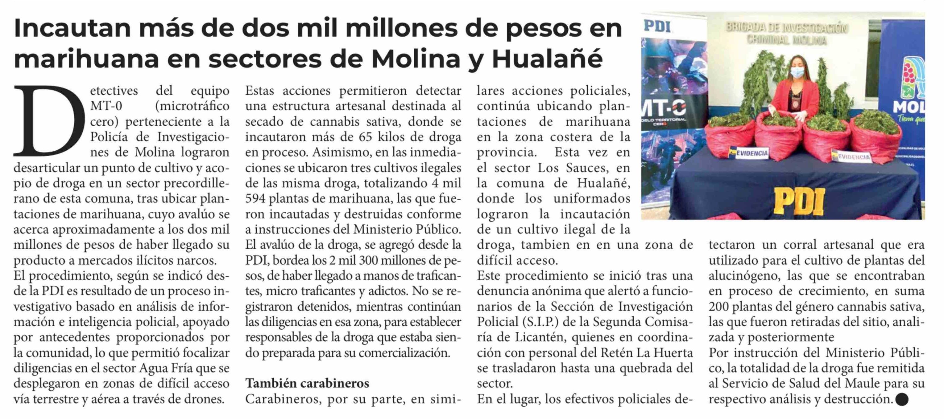 Título: Incautan más de dos mil millones de pesos en marihuana en sectores de Molina y Hualañé