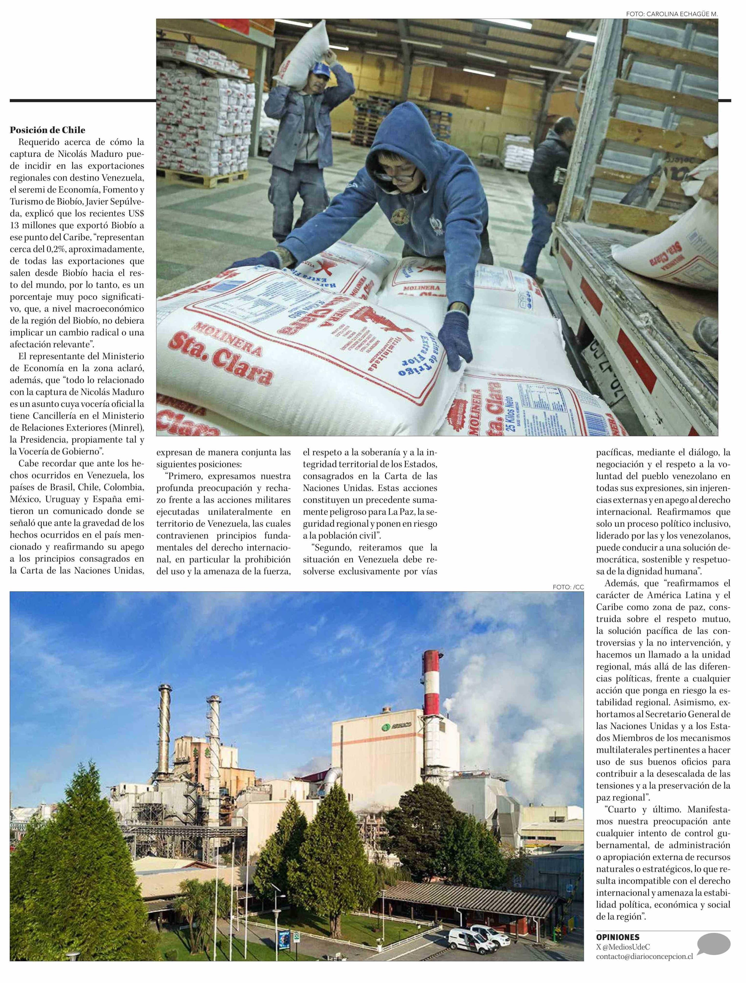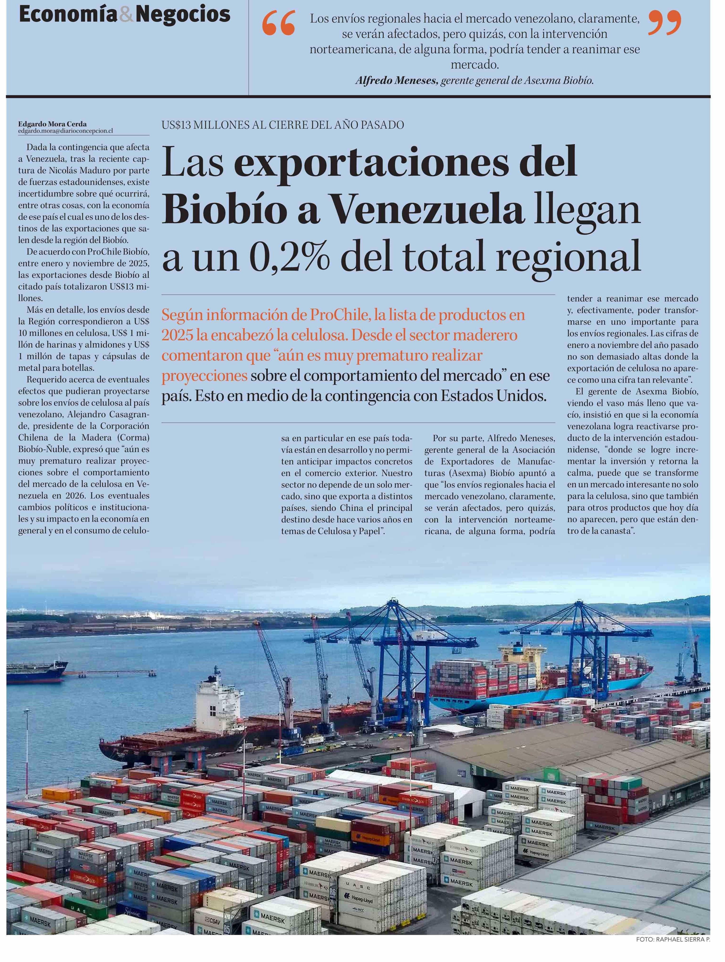 Las exportaciones del Biobío a Venezuela llegan a un 0,2% del total regional 08-01-2026 Diario Concepción |