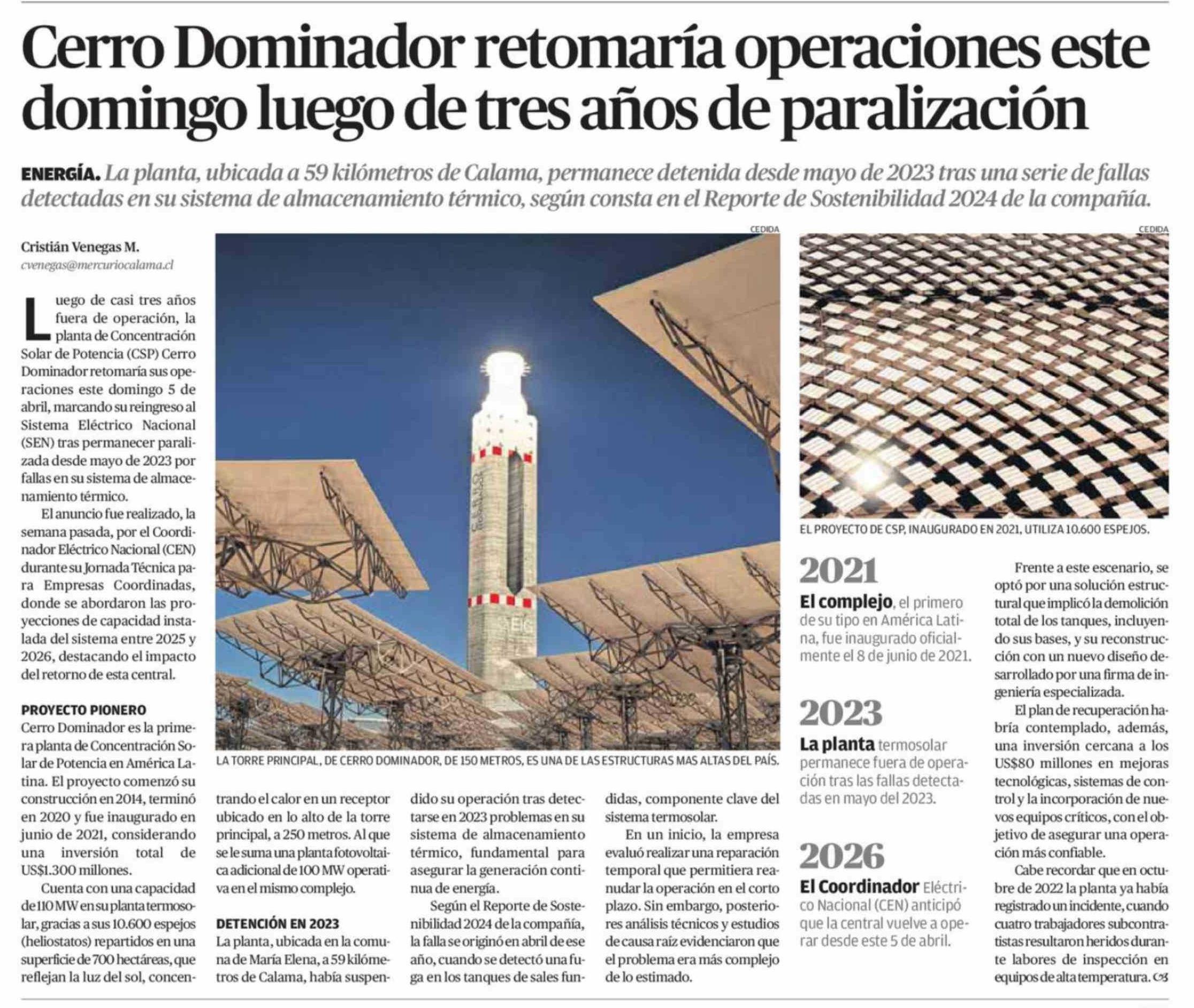 Título: Cerro Dominador retomaría operaciones este domingo luego de tres años de paralización
