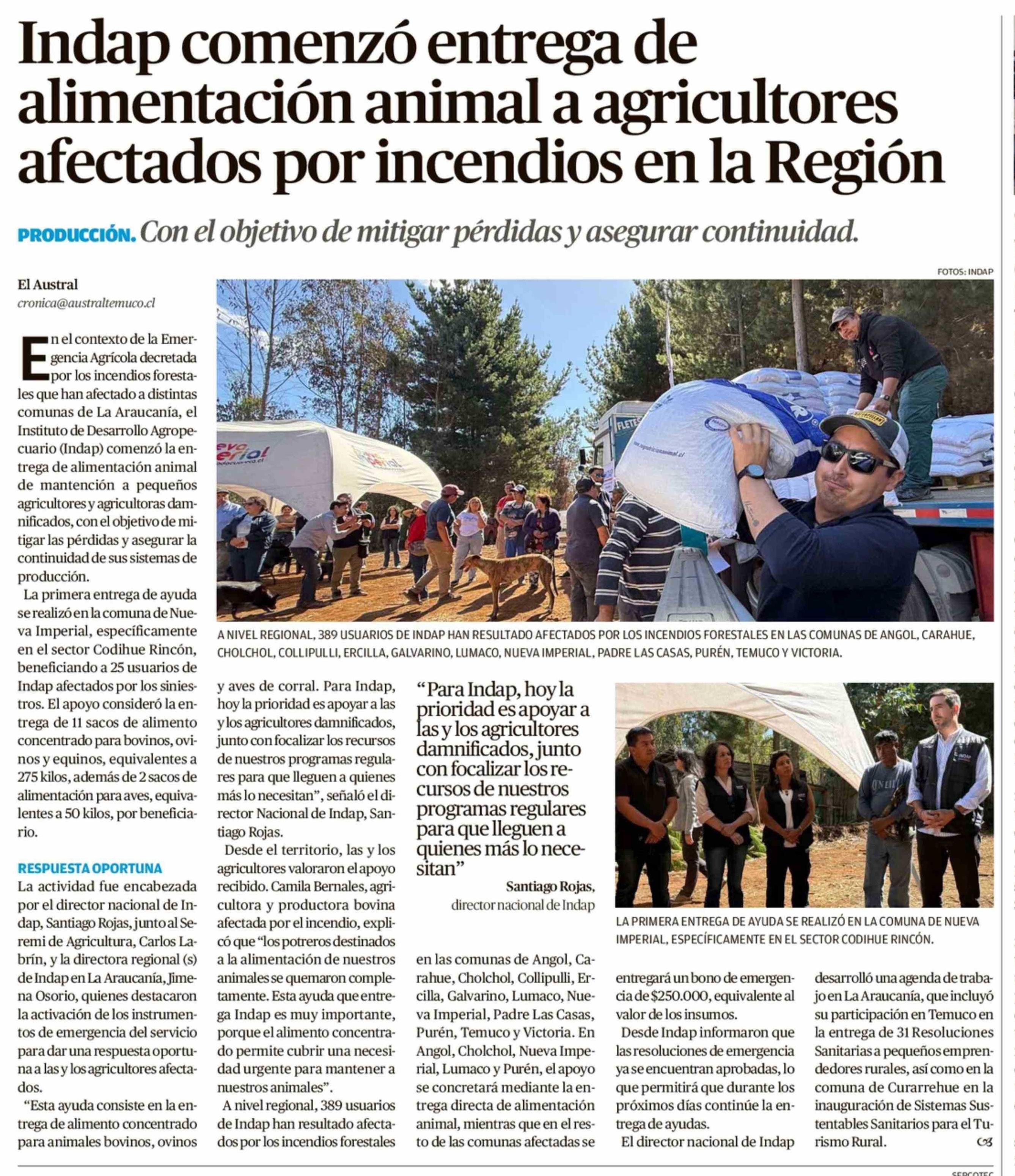 Indap comenzó entrega de alimentación animal a agricultores afectados por incendios en la Región 07-02-2026 El Austral de la Araucanía |