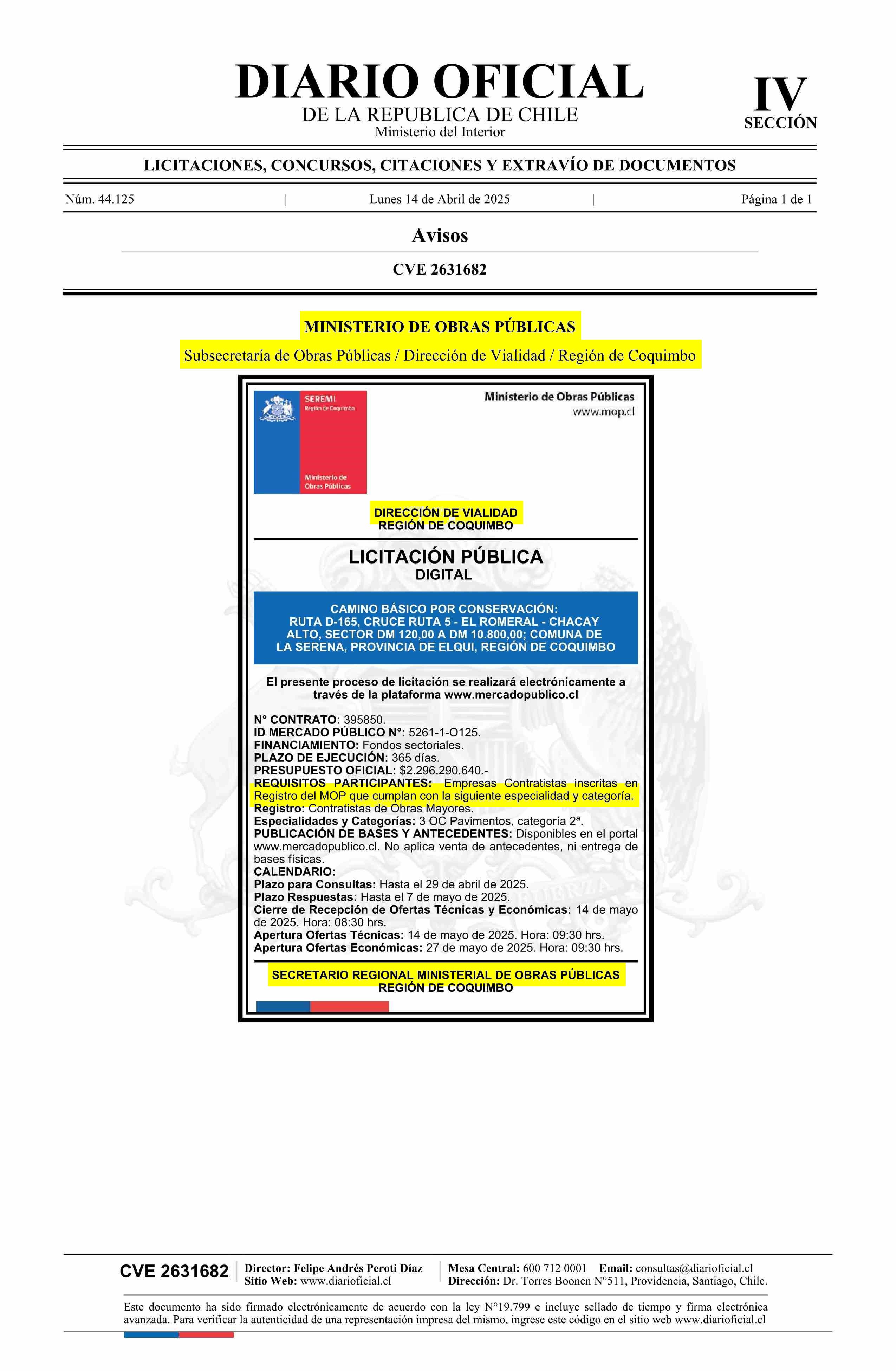 Título: AVISO LICITACIONES: Camino Básico por Conservación: Ruta D-165, Cruce Ruta 5 - El Romeral - Chacay Alto, Sector DM 120,00 a DM 10.800,00; Comuna de La Serena, Provincia de Elqui, Región de Coquimbo