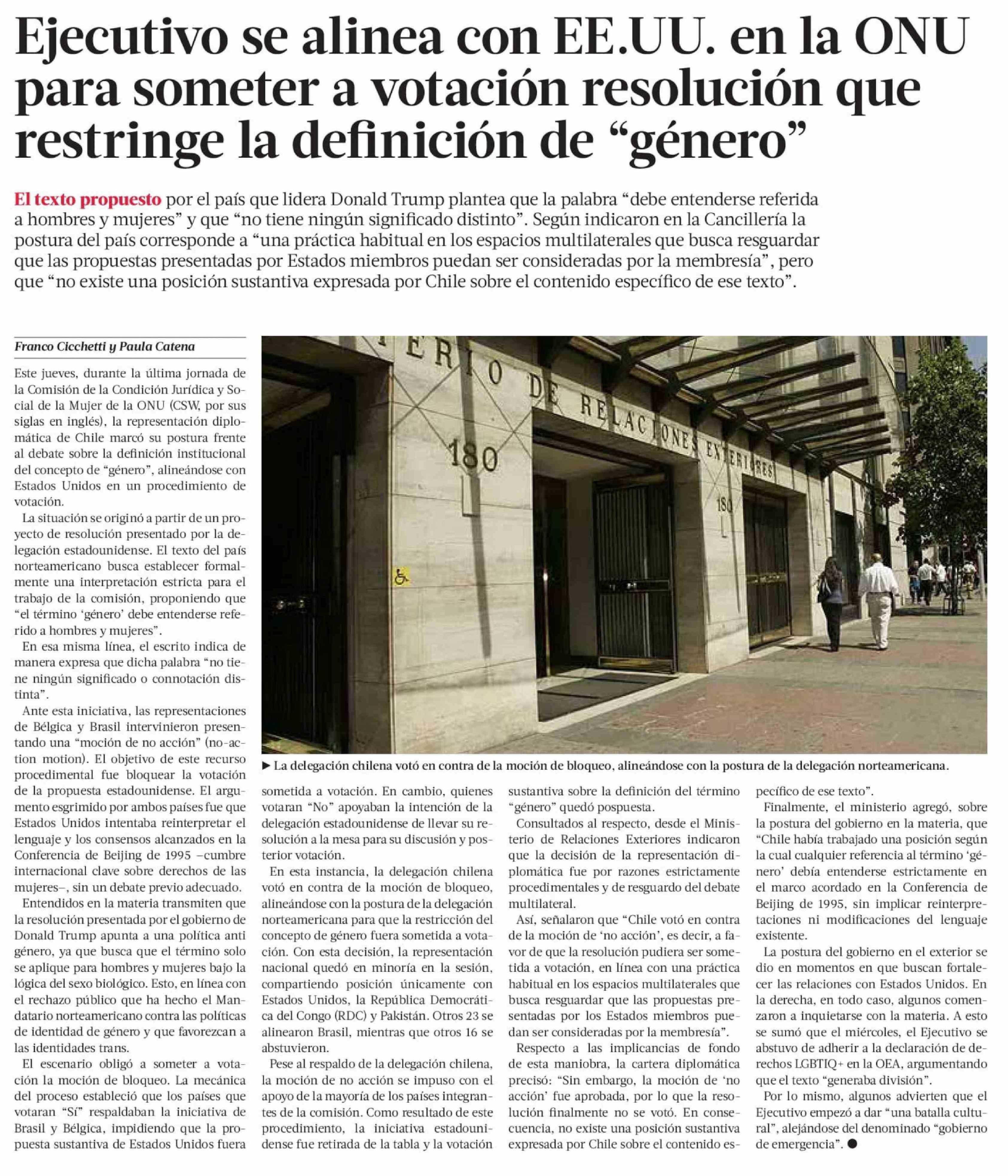 Ejecutivo se alinea con EE.UU. en la ONU para someter a votación resolución que restringe la definición de "género" 20-03-2026 La Tercera |