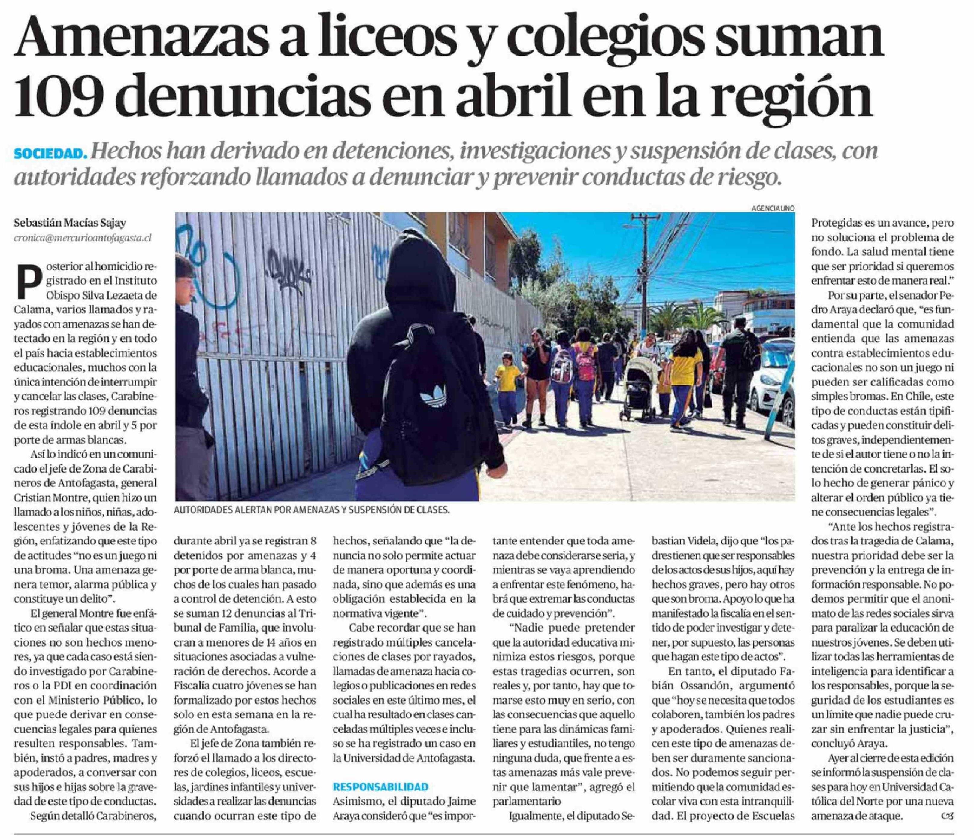 Título: Amenazas a liceos y colegios suman 109 denuncias en abril en la región