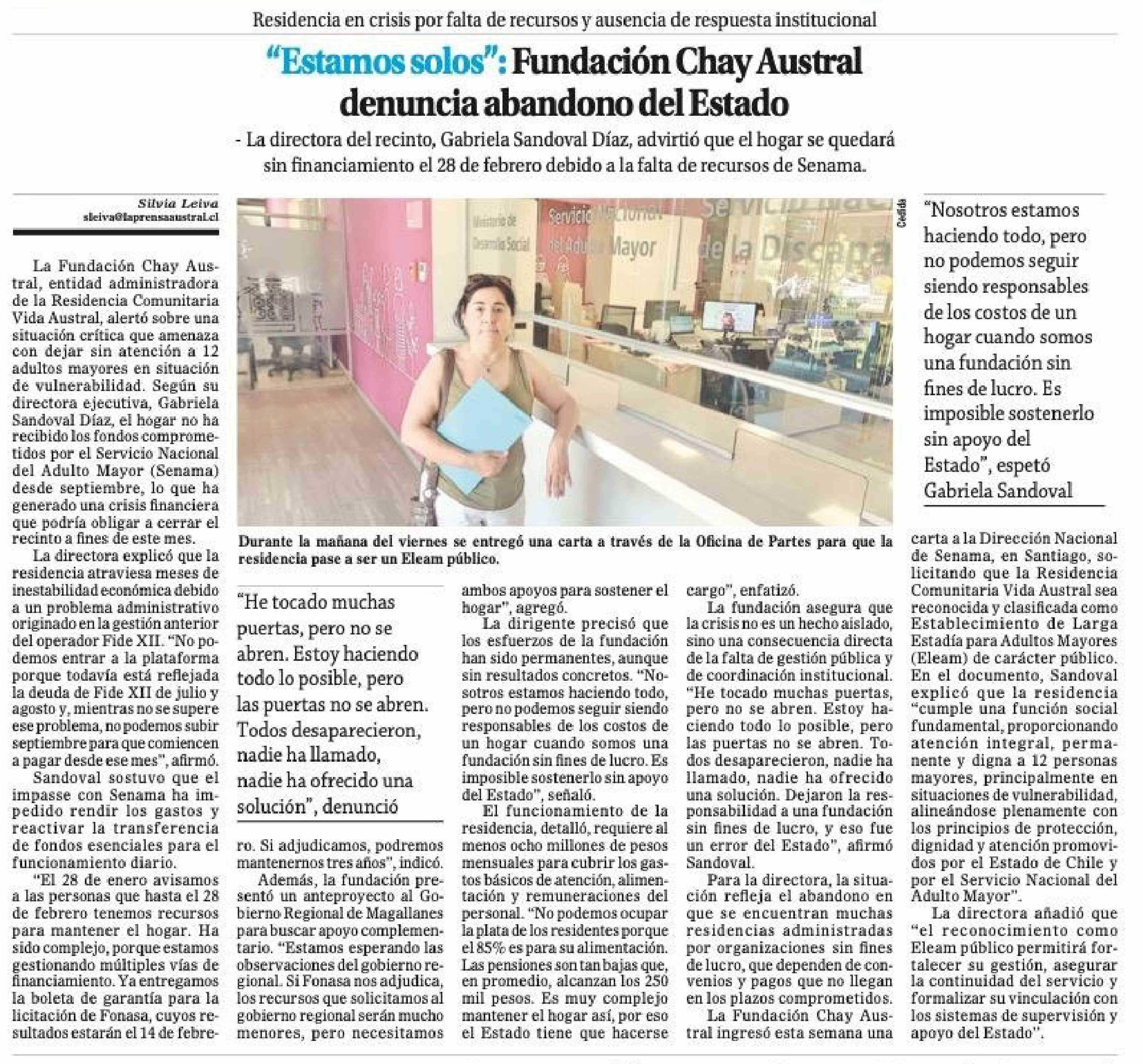 "Estamos solos": Fundación Chay Austral denuncia abandono del Estado 01-02-2026 El Magallanes |