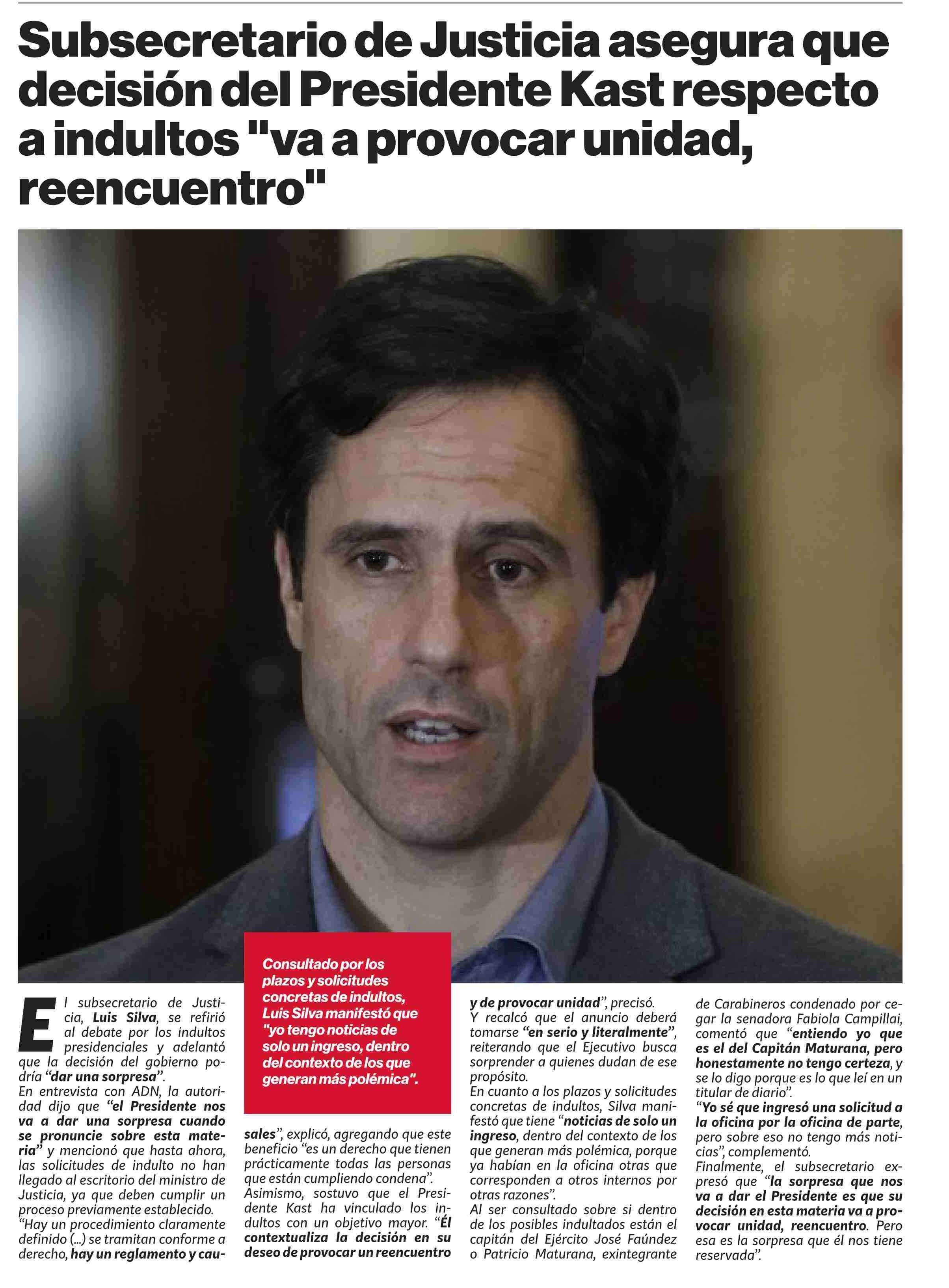 Subsecretario de Justicia asegura que decisión del Presidente Kast respecto aindultos "va a provocar unidad, reencuentro” 23-03-2026 Puranoticia.cl |