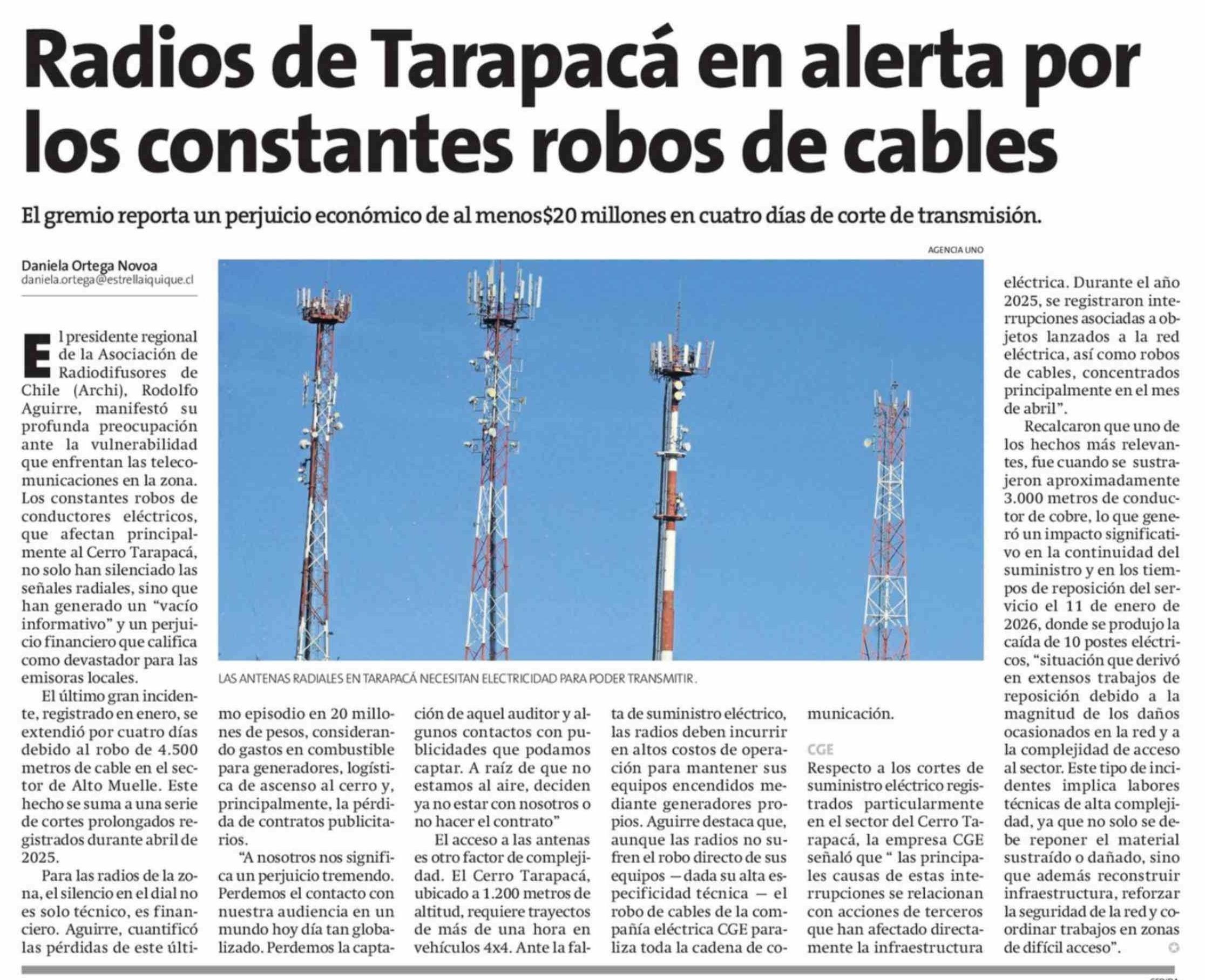 Radios de Tarapacá en alerta por los constantes robos de cables 09-02-2026 La Estrella de Iquique |