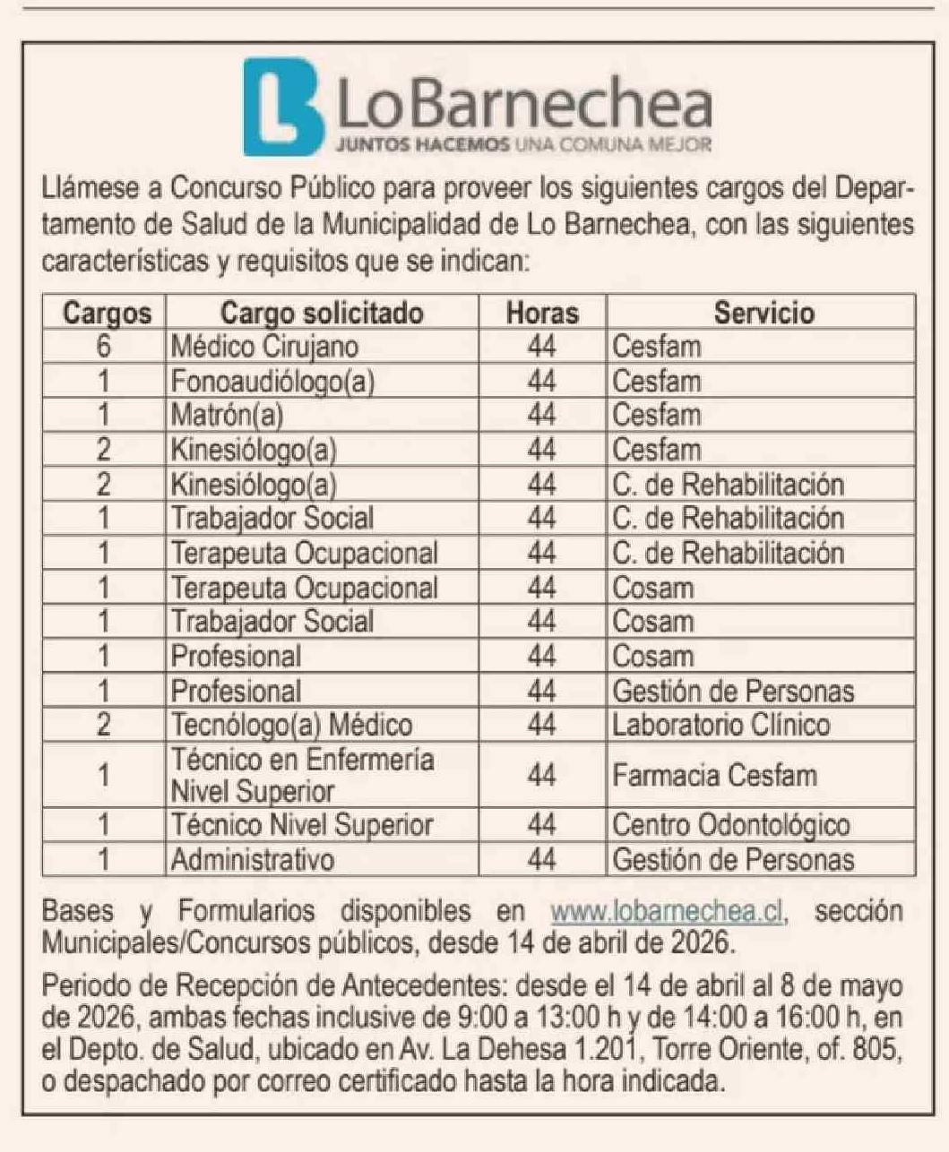 AVISO LICITACIONES: Municipaidad de Lo Bamechea, 13-04-2026 Diario Financiero |