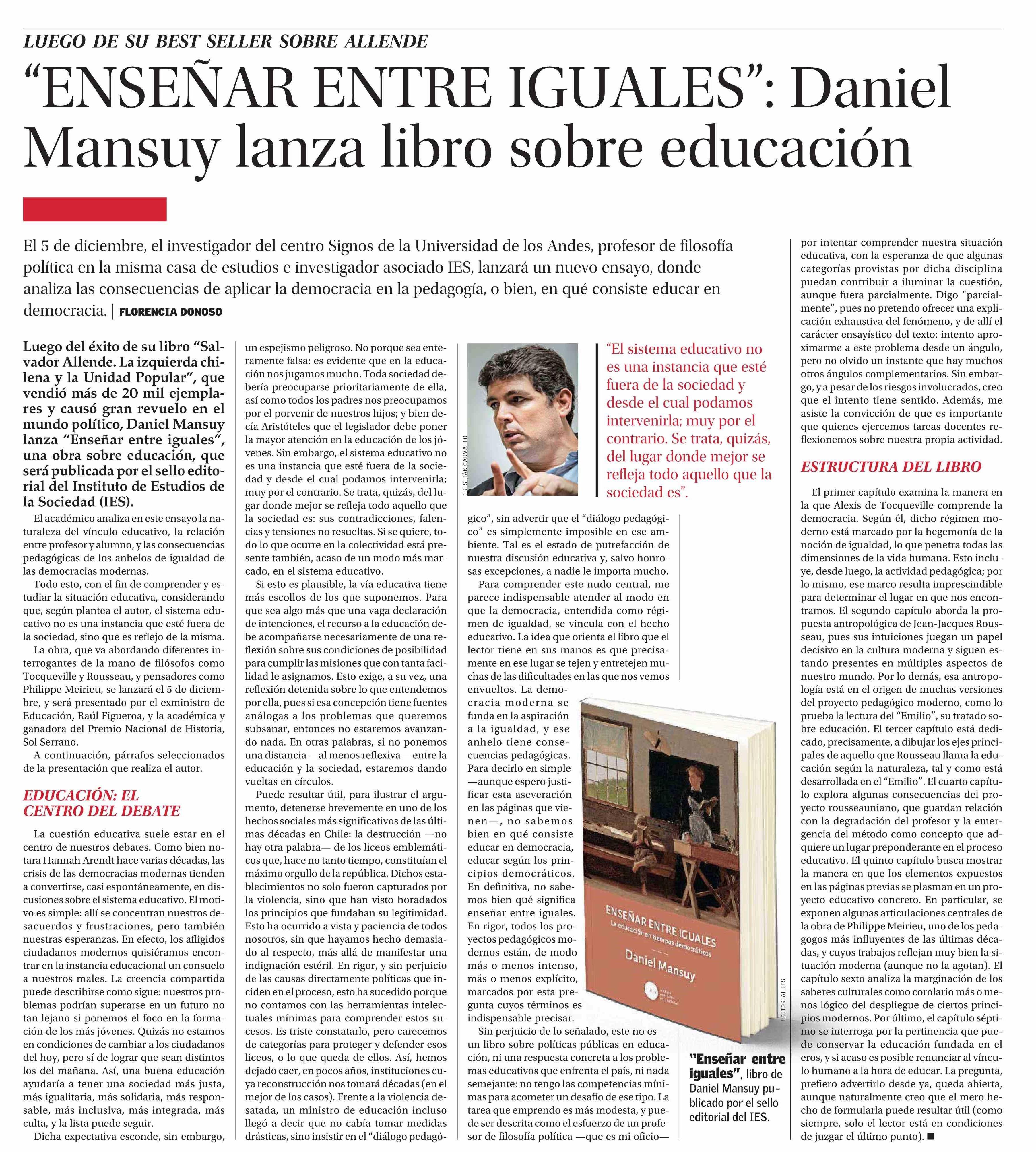 "ENSEÑAR ENTRE IGUALES": Daniel Mansuy lanza libro sobre educación 19-11-2023 El Mercurio |