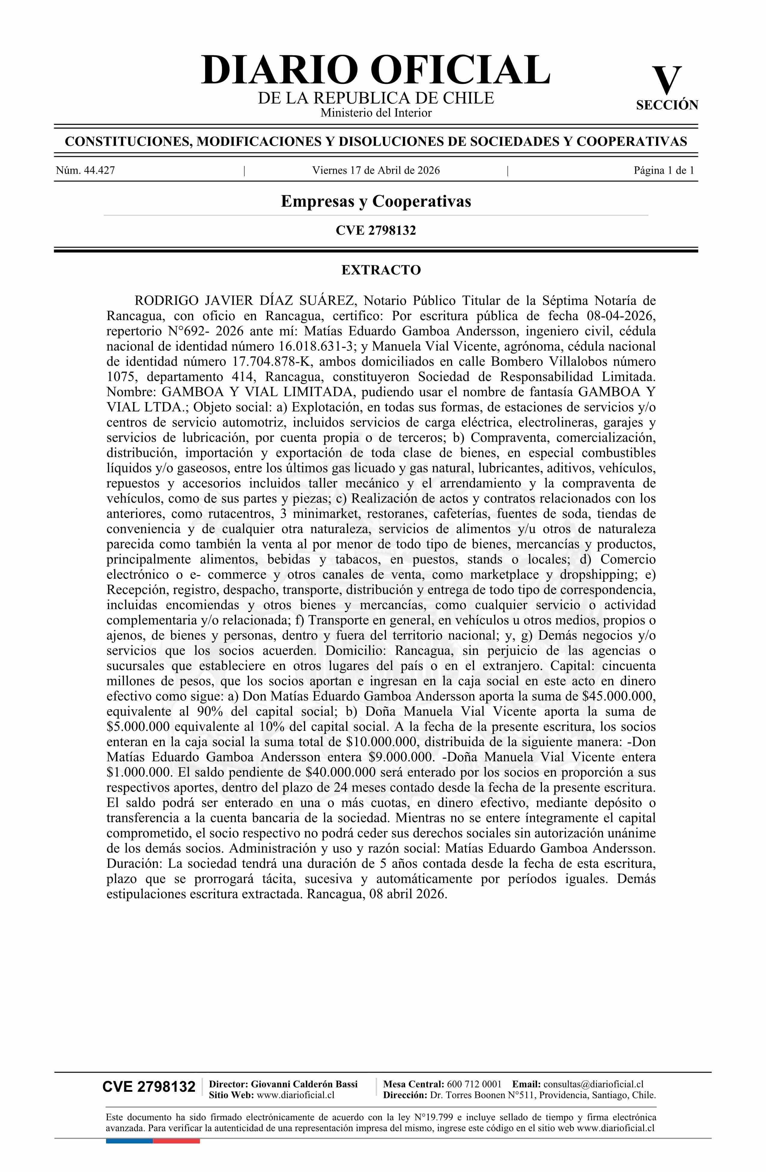 GAMBOA Y VIAL LIMITADA 17-04-2026 Diario Oficial Edición Electrónica |