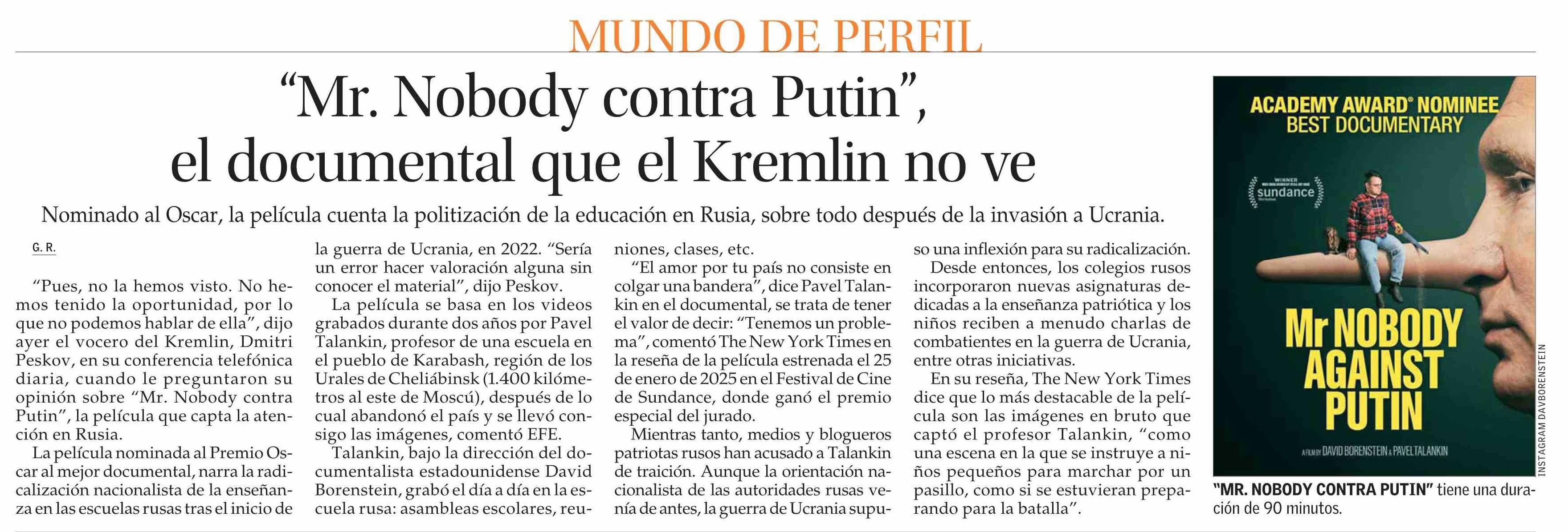 “Mr. Nobody contra Putin”, el documental que el Kremlin no ve 05-02-2026 El Mercurio |