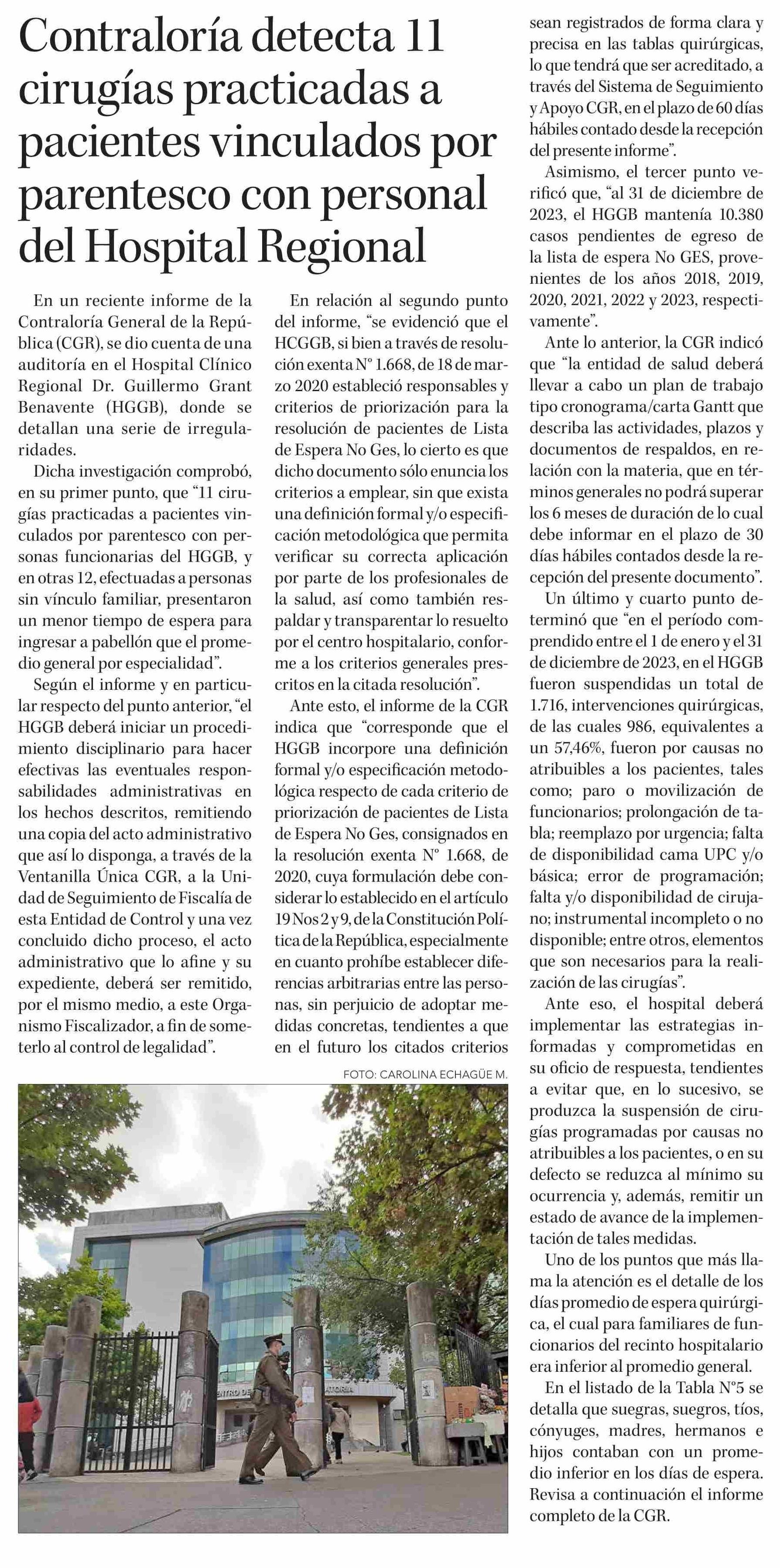 Contraloría detecta 11 cirugías practicadas a pacientes vinculados por parentesco con personal del Hospital Regional 21-05-2025 Diario Concepción |