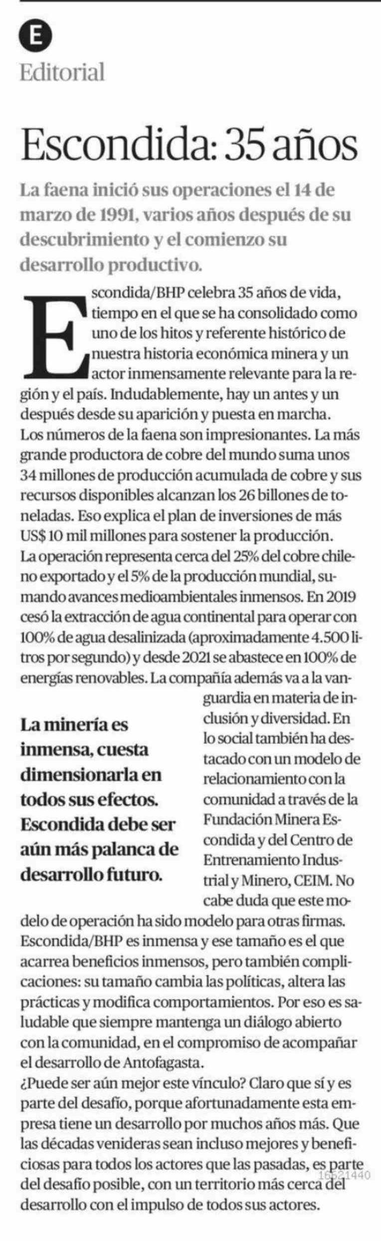 Editorial: Escondida: 35 años 04-04-2026 El Mercurio de Calama |