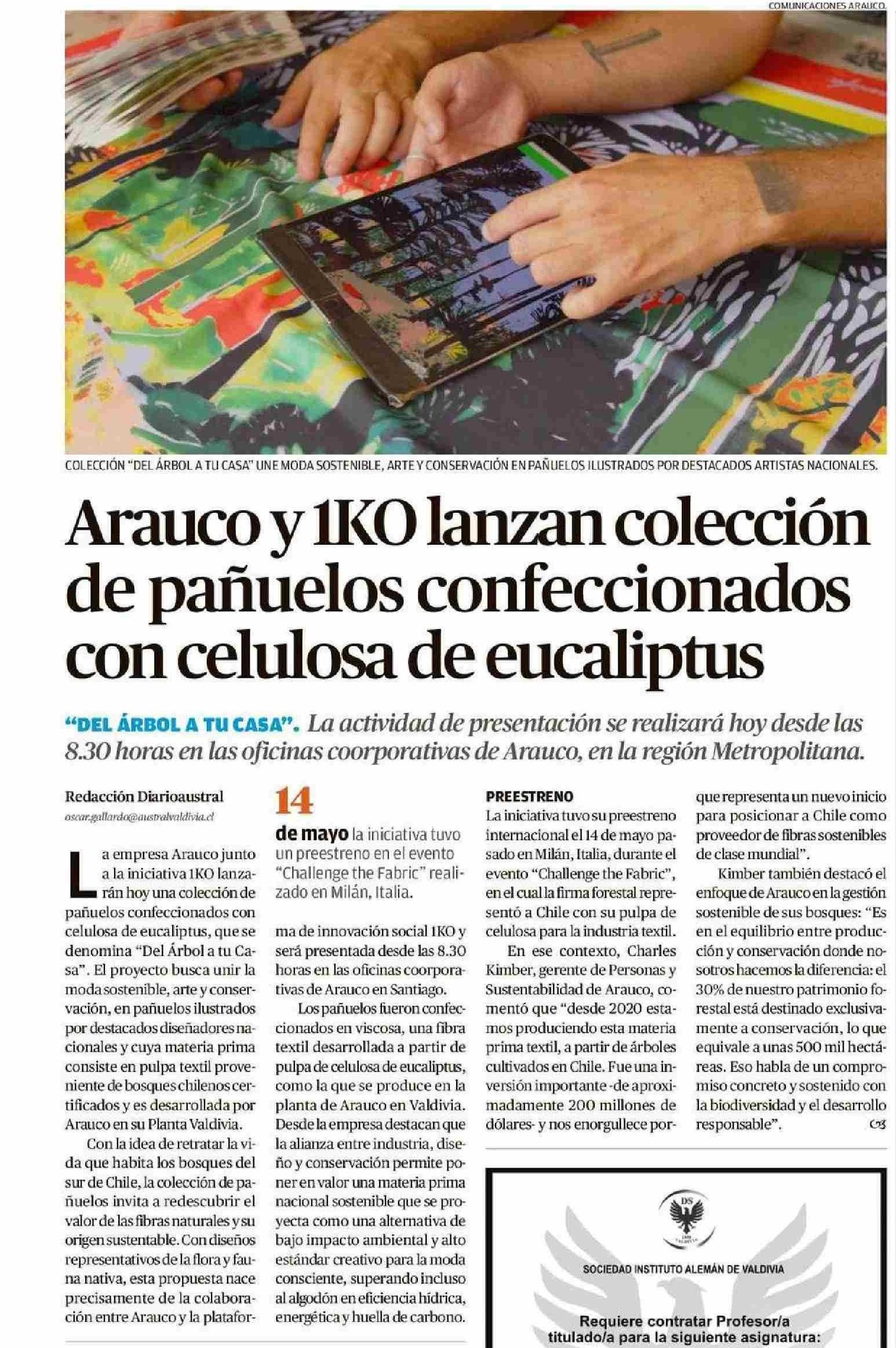 Arauco y 1KO lanzan colección de pañuelos confeccionados con celulosa de eucaliptus 17-06-2025 Diario Austral Región de Los Ríos |