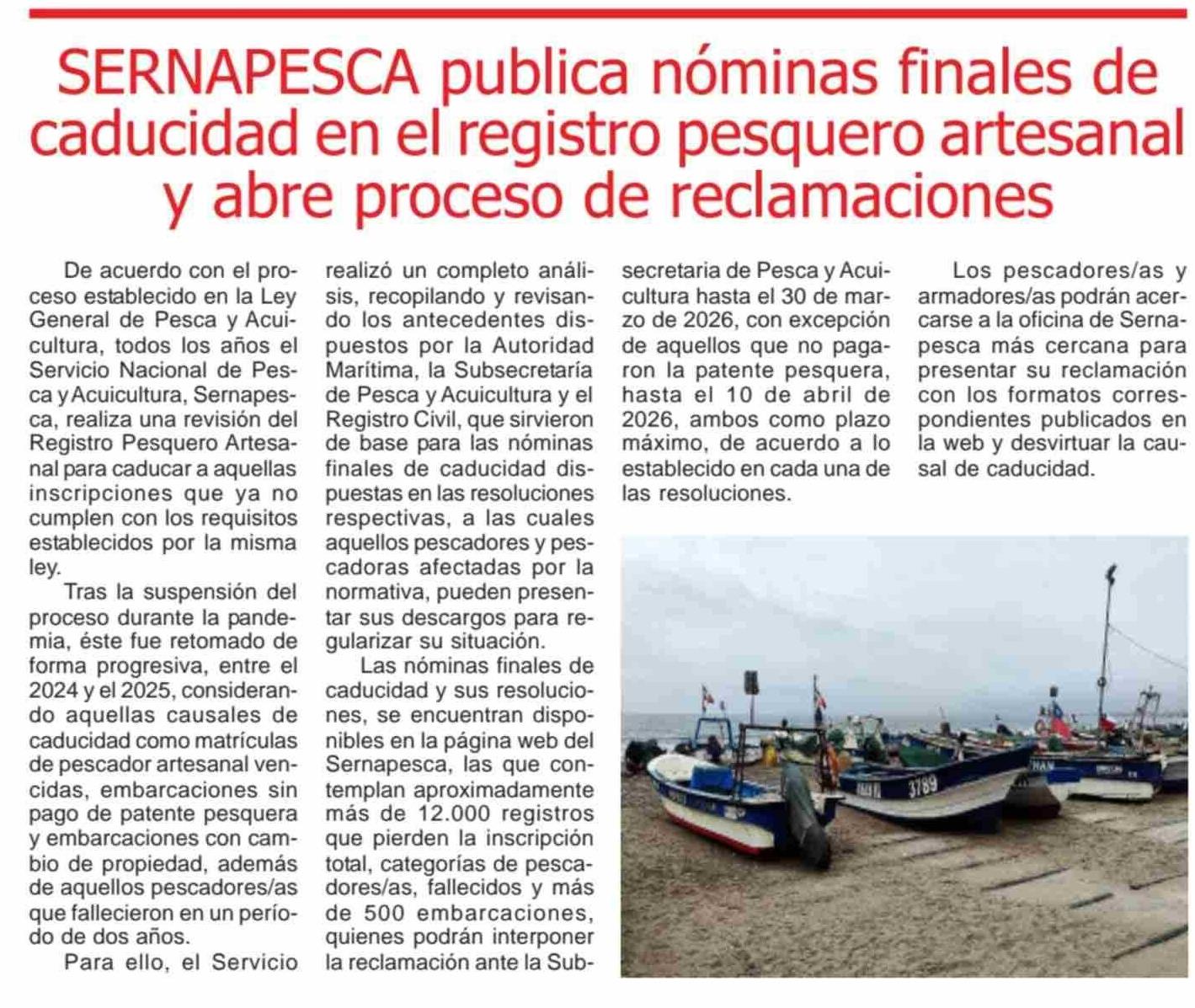 | Título: | SERNAPESCA publica nóminas finales de caducidad en el registro pesquero artesanal y abre proceso de reclamaciones |