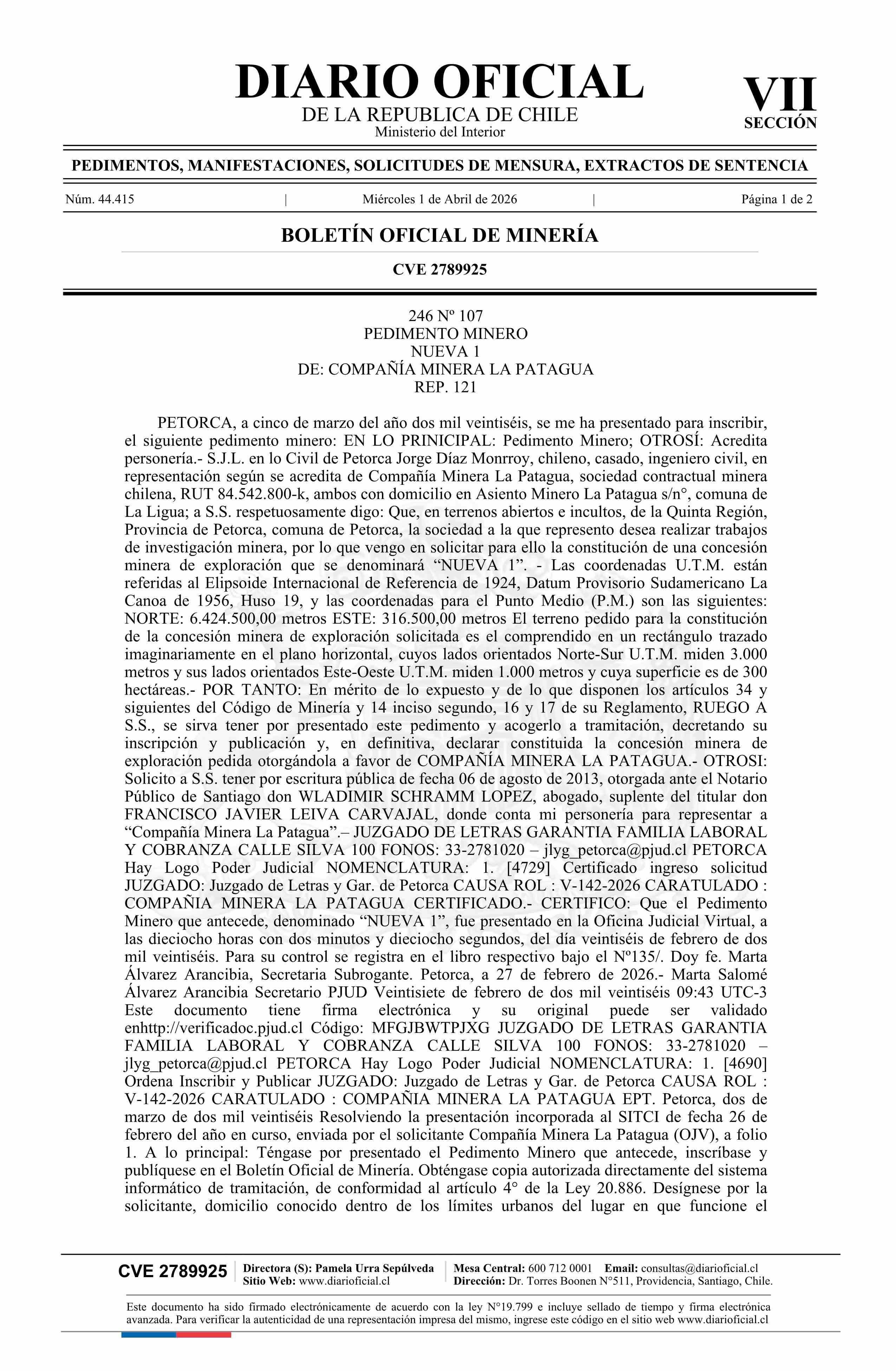 NUEVA 1 / Compañía Minera La Patagua 01-04-2026 DIARIO OFICIAL CHILE - BOLETÍN OFICIAL DE MINERÍA |