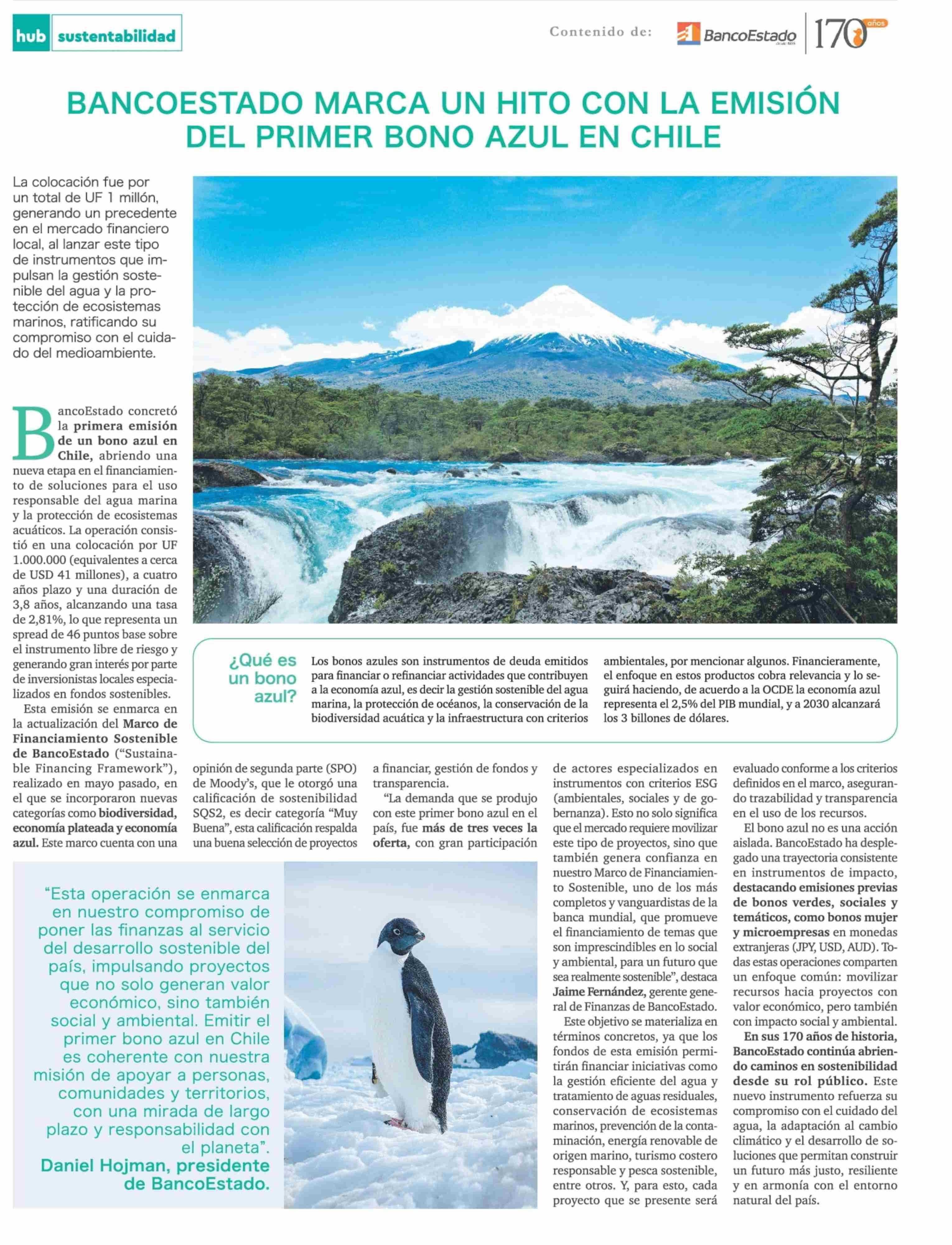 BANCOESTADO MARCA UN HITO CON LA EMISIÓN DEL PRIMER BONO AZUL EN CHILE 21-06-2025 La Tercera |