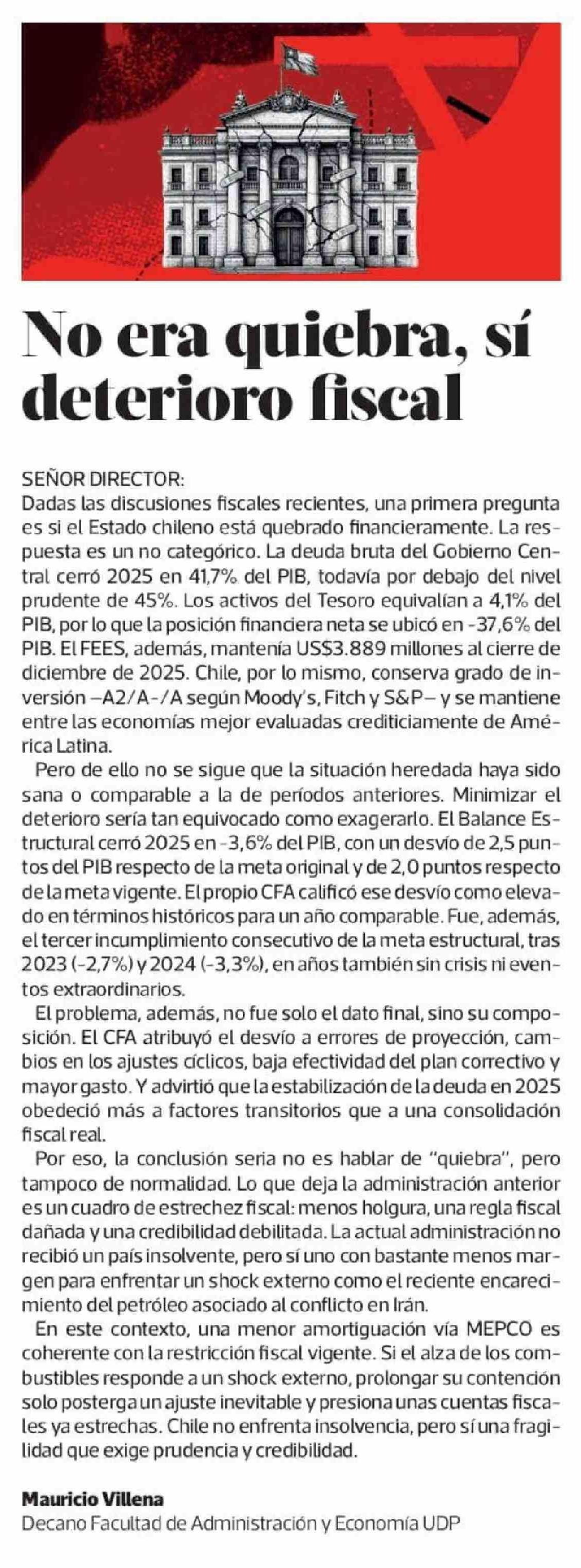 Cartas: No era quiebra, sí deterioro fiscal 28-03-2026 La Tercera |