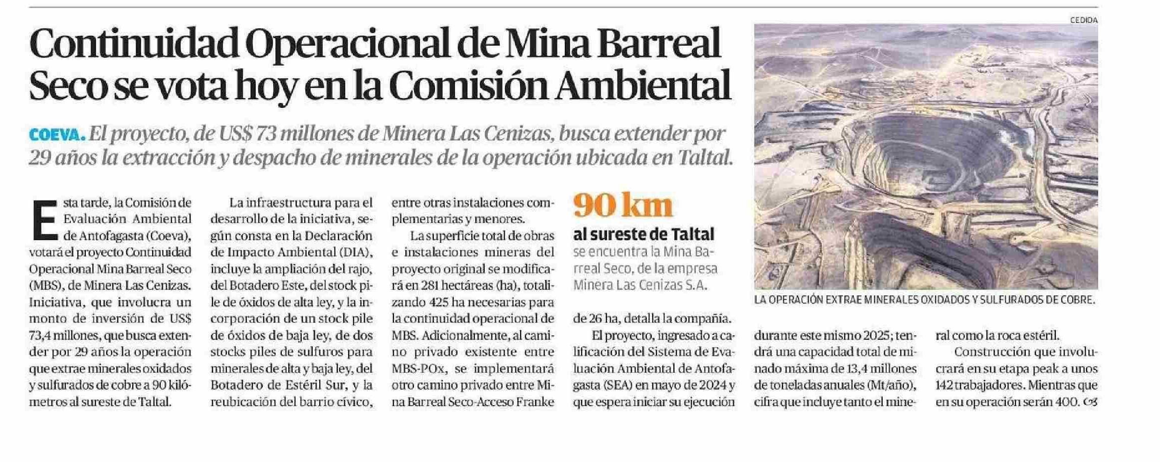 Continuidad Operacional de Mina Barreal Seco se vota hoy en la Comisión Ambiental 04-06-2025 El Mercurio de Antofagasta |